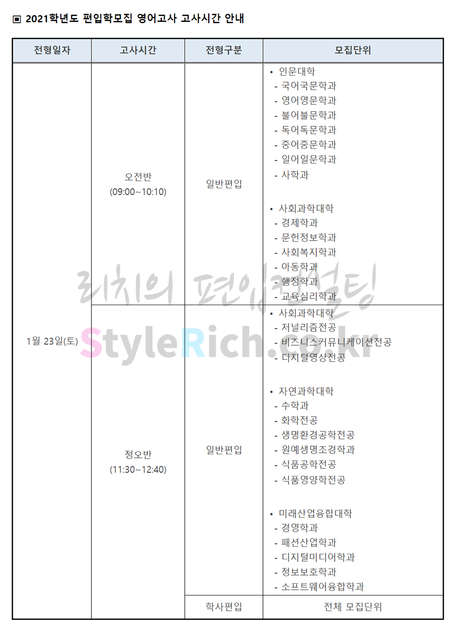 서울여대 편입 2021학년도 영어고사 시간안내 간편하게 보자! 2021.01.23 21:54 편입 유의사항/2021학년도 유의사항 2021학년도 서울여대 편입 영어고사 시간안내를 살펴보겠습니다. * 내용의 일부가 변경되거나 오표기가 있을 수 있으므로 시험 전 반드시 서울여대 입학처에 최종적으로 확인바랍니다. 2021학년도 서울여대 편입 영어고사 시간안내 <출처: 서울여대> 홍보바롬이와 함께하는 학교생활 밸런스게임 공유하기 게시글 관리 리치의 편입컨설팅 저작자표시 비영리 변경금지 (새창열림) '편입 유의사항 > 2021학년도 유의사항' 카테고리의 다른 글 서경대 편입 2021학년도 필기고사 유의사항 간편하게 보자! (0) 2021.01.16 상명대 편입 2021학년도 필기고사 안내사항 간편하게 보자! (0) 2021.01.16 서울시립대 편입 2021학년도 전공적성 안내사항 간편하게 보자! (0) 2021.01.16 한성대 편입 2021학년도 필기시험 안내사항 간편하게 보자! (0) 2021.01.16 아주대 편입 2021학년도 필기시험 유의사항 간편하게 보자! (0) 2021.01.16 댓글 공유하기 다른 글 댓글 이 글 공유하기 구독하기 구독하기 카카오톡 카카오톡 라인 라인 트위터 트위터 Facebook Facebook 카카오스토리 카카오스토리 밴드 밴드 네이버 블로그 네이버 블로그 Pocket Pocket Evernote Evernote 다른 글 서경대 편입 2021학년도 필기고사 유의사항 간편하게 보자! 서경대 편입 2021학년도 필기고사 유의사항 간편하게 보자! 2021.01.16 상명대 편입 2021학년도 필기고사 안내사항 간편하게 보자! 상명대 편입 2021학년도 필기고사 안내사항 간편하게 보자! 2021.01.16 서울시립대 편입 2021학년도 전공적성 안내사항 간편하게 보자! 서울시립대 편입 2021학년도 전공적성 안내사항 간편하게 보자! 2021.01.16 한성대 편입 2021학년도 필기시험 안내사항 간편하게 보자! 한성대 편입 2021학년도 필기시험 안내사항 간편하게 보자! 2021.01.16 다른 글 더 둘러보기