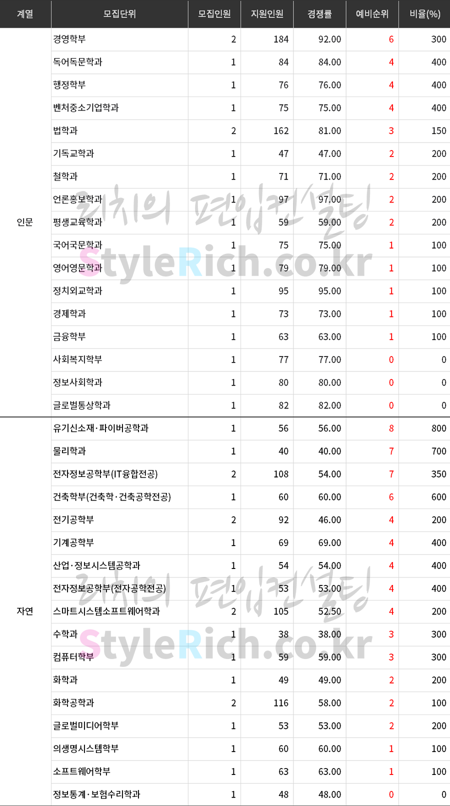 * 건축학부(실내건축전공)은 자연계열이지만 영어고사를 실시하여 자연(영어)로 별도 분류