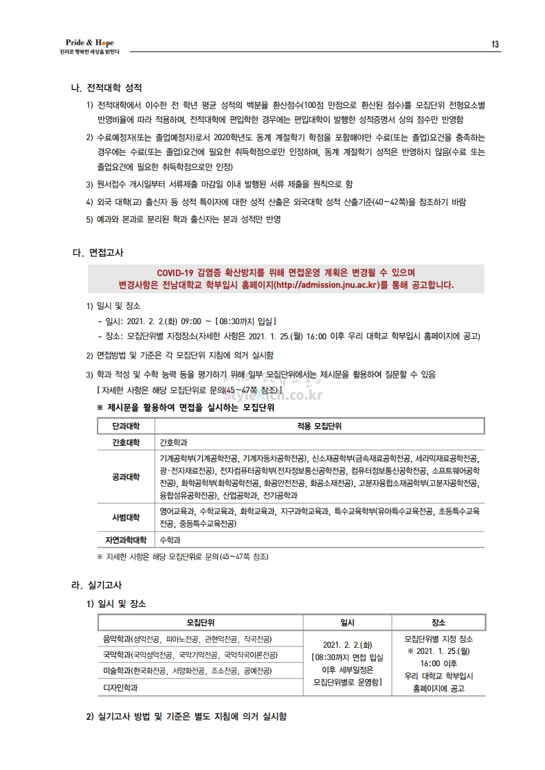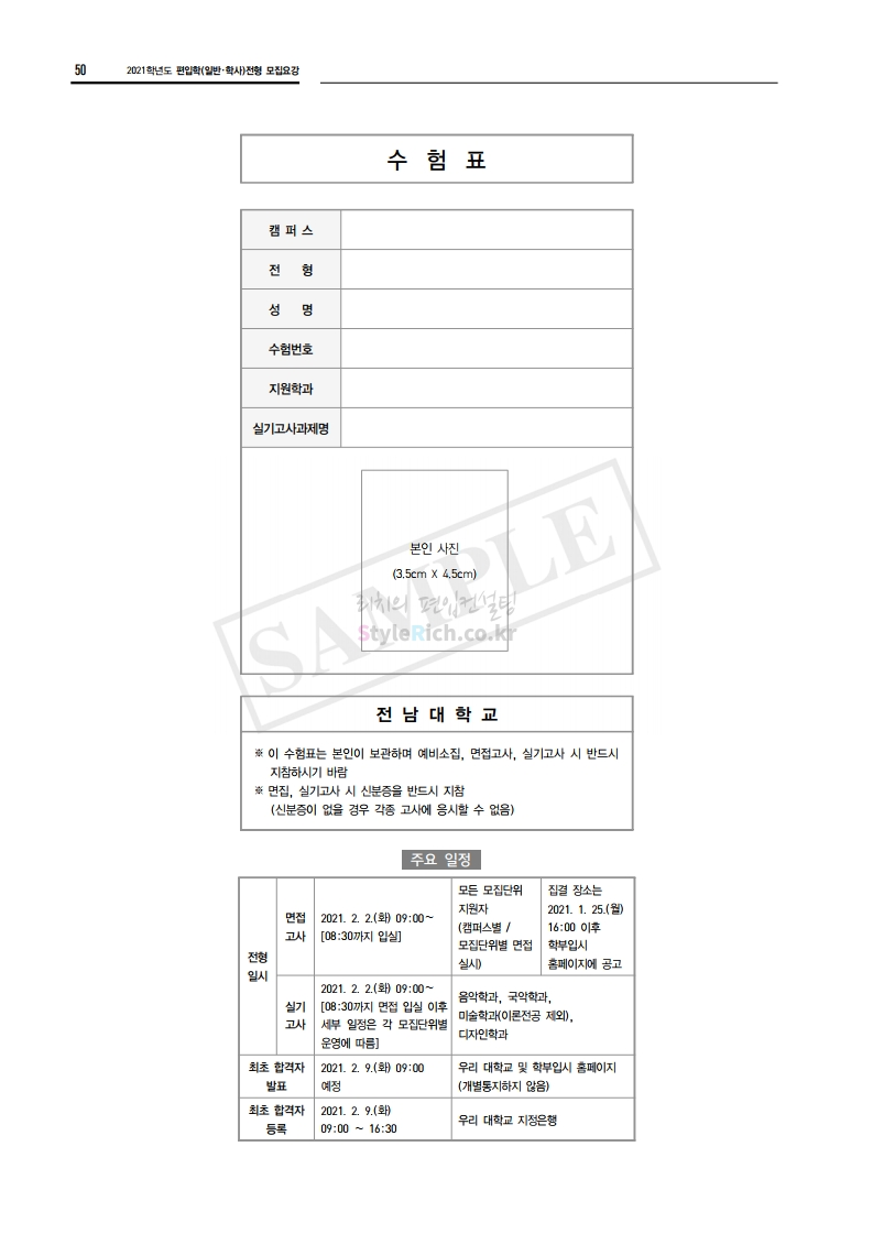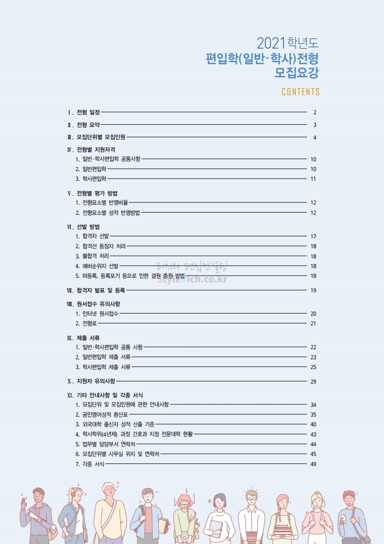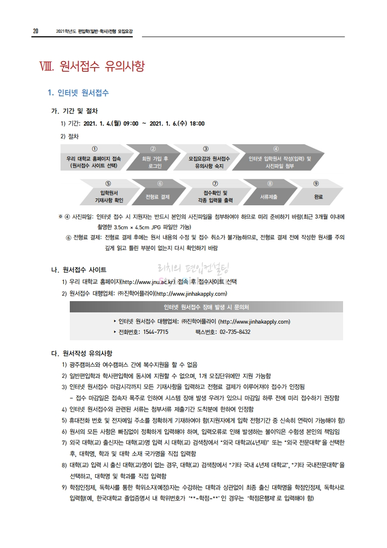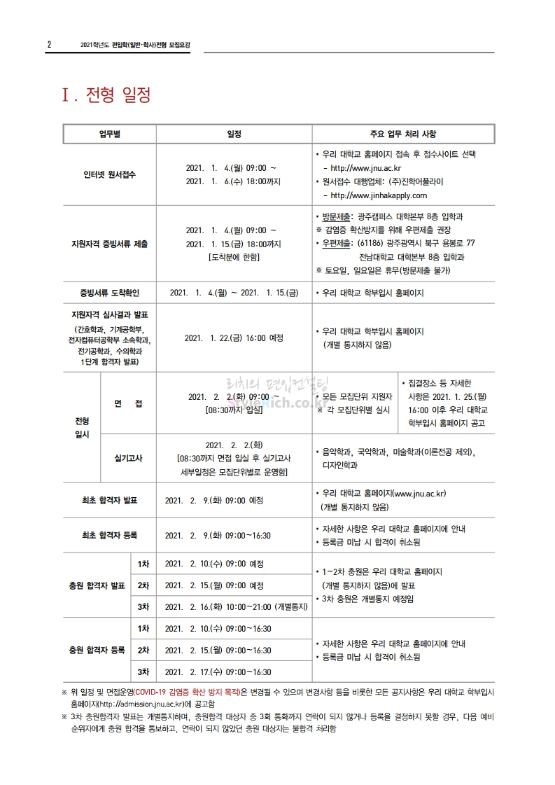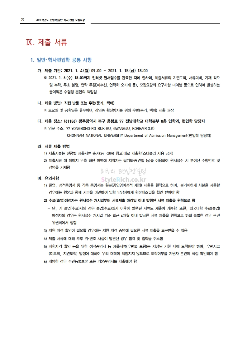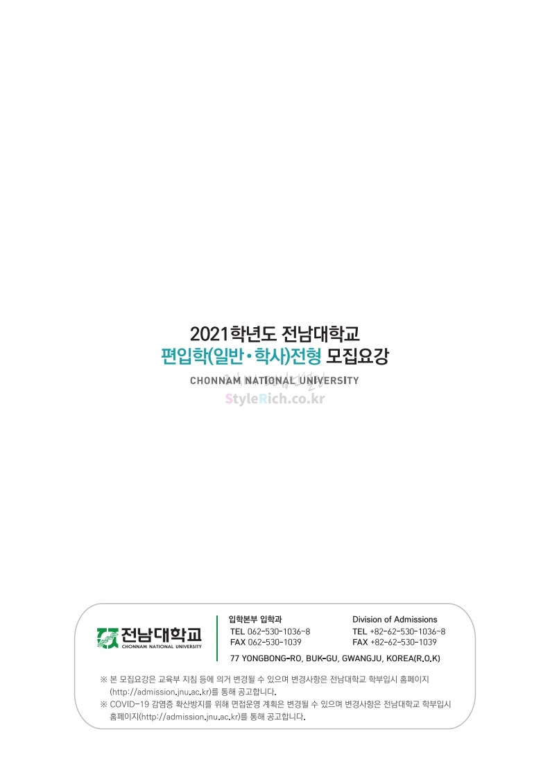 전남대 편입 2021학년도 모집요강 간편하게 보자! 2021.03.07 11:40 편입 모집요강/2021학년도 모집요강 2021학년도 전남대 편입 모집요강(2020.12.03 기준)을 간편하게 확인하세요. PC나 모바일에서 이미지를 클릭(터치) 후 이미지의 좌우측을 클릭(터치)하면 모집요강의 순서를 앞뒤로 넘길 수 있습니다. 좌측 클릭(터치)는 이전 페이지, 우측 클릭(터치)는 다음 페이지입니다. 2021학년도 전남대 편입 모집요강 다운받기 ☆ 2021학년도 편입학전형 모집요강-웹용-표준.pdf 3.44MB <출처: 전남대> [전남대학교]2021학년도 1학기 수업 방식이 궁금해요 공유하기 게시글 관리 리치의 편입컨설팅 저작자표시 비영리 변경금지 (새창열림) '편입 모집요강 > 2021학년도 모집요강' 카테고리의 다른 글 제주대 편입 2021학년도 모집요강 간편하게 보자! (0) 2021.03.07 전북대 편입 2021학년도 모집요강 간편하게 보자! (0) 2021.03.07 부산대 편입 2021학년도 모집요강 간편하게 보자! (0) 2021.03.07 경상대 편입 2021학년도 모집요강 간편하게 보자! (0) 2021.03.06 경북대 편입 2021학년도 모집요강 간편하게 보자! (0) 2021.03.04 댓글 공유하기 다른 글 댓글 이 글 공유하기 구독하기 구독하기 카카오톡 카카오톡 라인 라인 트위터 트위터 Facebook Facebook 카카오스토리 카카오스토리 밴드 밴드 네이버 블로그 네이버 블로그 Pocket Pocket Evernote Evernote 다른 글 제주대 편입 2021학년도 모집요강 간편하게 보자! 제주대 편입 2021학년도 모집요강 간편하게 보자! 2021.03.07 전북대 편입 2021학년도 모집요강 간편하게 보자! 전북대 편입 2021학년도 모집요강 간편하게 보자! 2021.03.07 부산대 편입 2021학년도 모집요강 간편하게 보자! 부산대 편입 2021학년도 모집요강 간편하게 보자! 2021.03.07 경상대 편입 2021학년도 모집요강 간편하게 보자! 경상대 편입 2021학년도 모집요강 간편하게 보자! 2021.03.06 다른 글 더 둘러보기