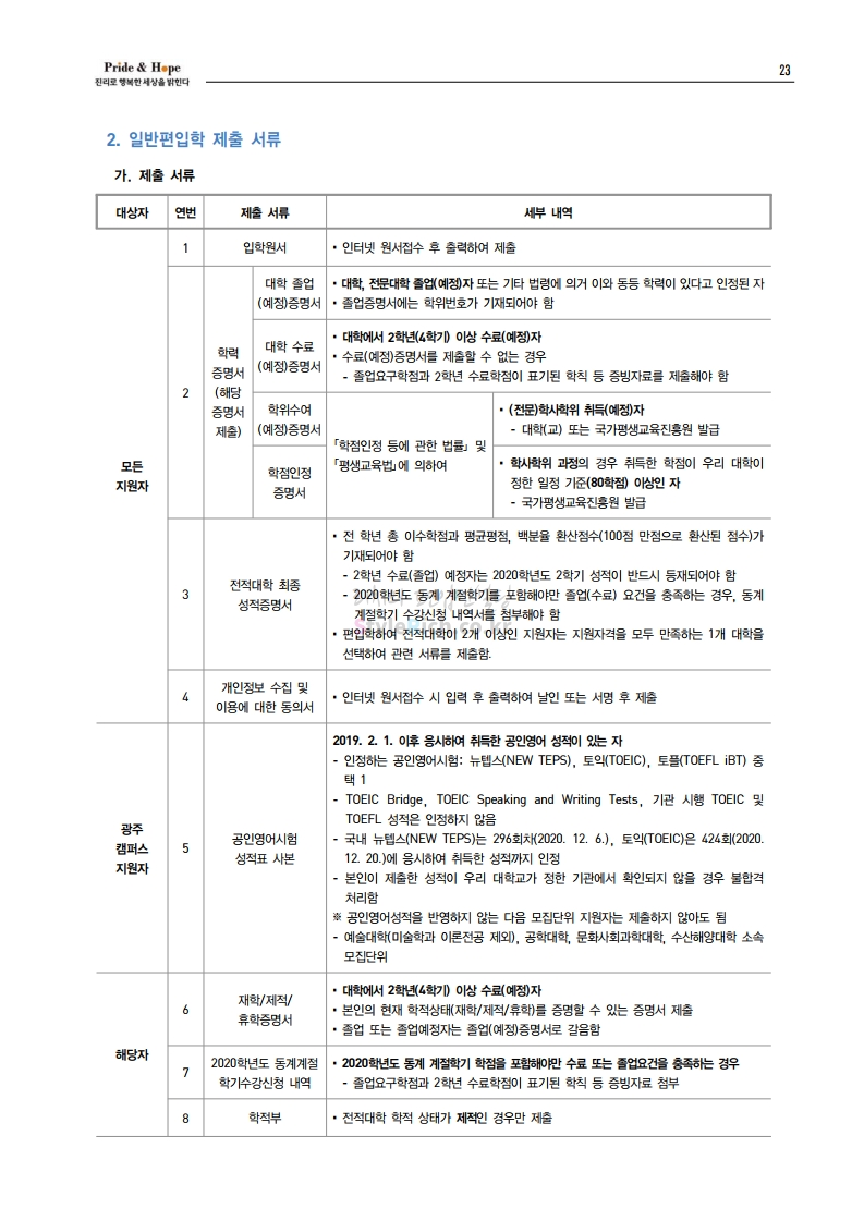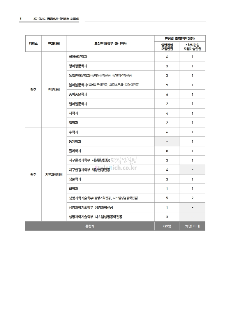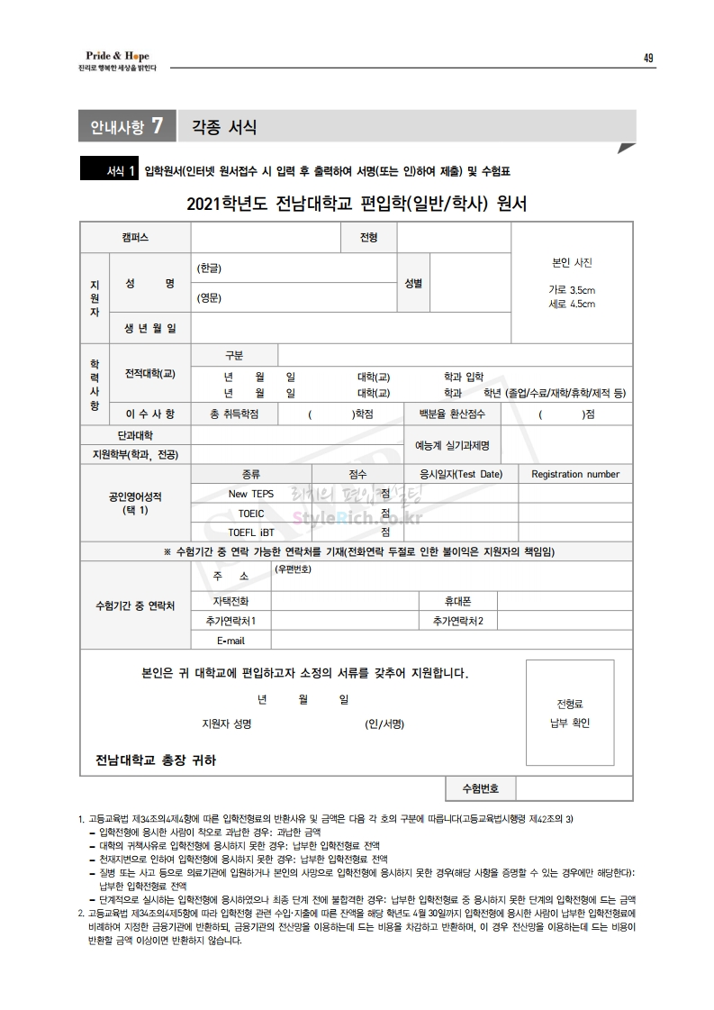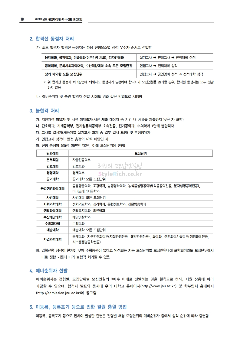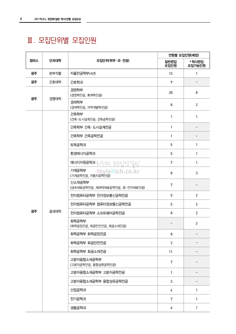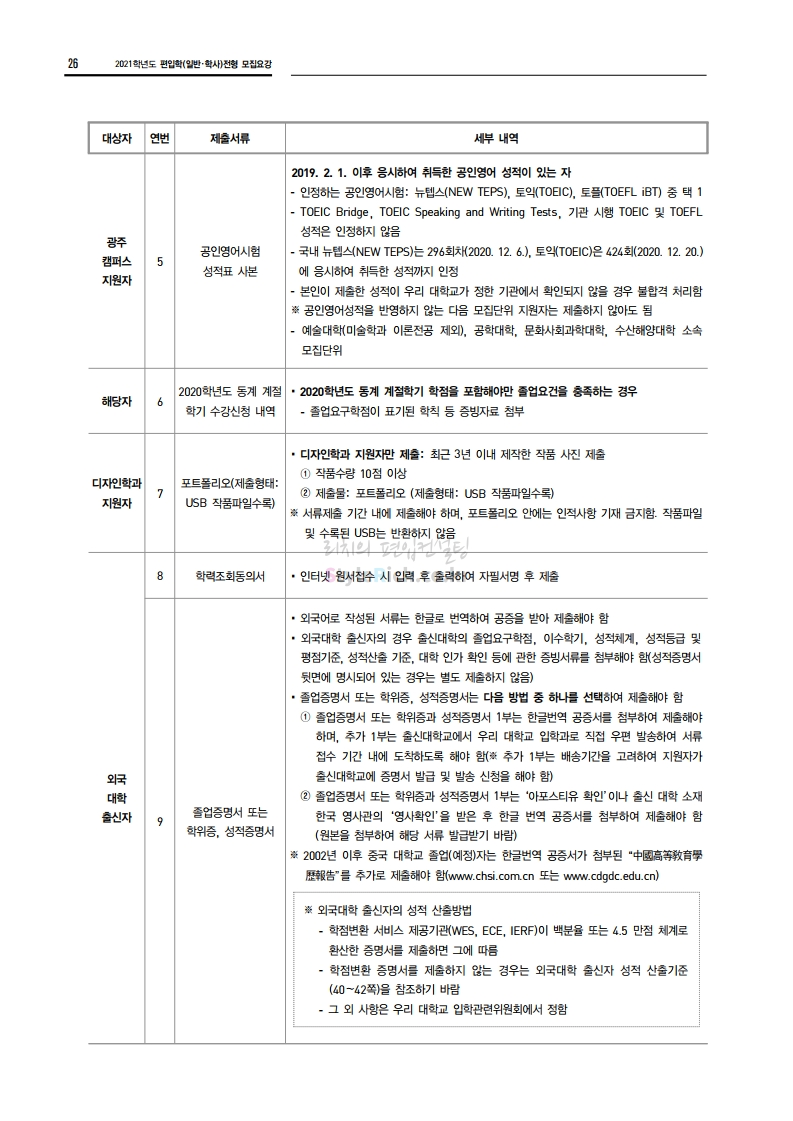 전남대 편입 2021학년도 모집요강 간편하게 보자! 2021.03.07 11:40 편입 모집요강/2021학년도 모집요강 2021학년도 전남대 편입 모집요강(2020.12.03 기준)을 간편하게 확인하세요. PC나 모바일에서 이미지를 클릭(터치) 후 이미지의 좌우측을 클릭(터치)하면 모집요강의 순서를 앞뒤로 넘길 수 있습니다. 좌측 클릭(터치)는 이전 페이지, 우측 클릭(터치)는 다음 페이지입니다. 2021학년도 전남대 편입 모집요강 다운받기 ☆ 2021학년도 편입학전형 모집요강-웹용-표준.pdf 3.44MB <출처: 전남대> [전남대학교]2021학년도 1학기 수업 방식이 궁금해요 공유하기 게시글 관리 리치의 편입컨설팅 저작자표시 비영리 변경금지 (새창열림) '편입 모집요강 > 2021학년도 모집요강' 카테고리의 다른 글 제주대 편입 2021학년도 모집요강 간편하게 보자! (0) 2021.03.07 전북대 편입 2021학년도 모집요강 간편하게 보자! (0) 2021.03.07 부산대 편입 2021학년도 모집요강 간편하게 보자! (0) 2021.03.07 경상대 편입 2021학년도 모집요강 간편하게 보자! (0) 2021.03.06 경북대 편입 2021학년도 모집요강 간편하게 보자! (0) 2021.03.04 댓글 공유하기 다른 글 댓글 이 글 공유하기 구독하기 구독하기 카카오톡 카카오톡 라인 라인 트위터 트위터 Facebook Facebook 카카오스토리 카카오스토리 밴드 밴드 네이버 블로그 네이버 블로그 Pocket Pocket Evernote Evernote 다른 글 제주대 편입 2021학년도 모집요강 간편하게 보자! 제주대 편입 2021학년도 모집요강 간편하게 보자! 2021.03.07 전북대 편입 2021학년도 모집요강 간편하게 보자! 전북대 편입 2021학년도 모집요강 간편하게 보자! 2021.03.07 부산대 편입 2021학년도 모집요강 간편하게 보자! 부산대 편입 2021학년도 모집요강 간편하게 보자! 2021.03.07 경상대 편입 2021학년도 모집요강 간편하게 보자! 경상대 편입 2021학년도 모집요강 간편하게 보자! 2021.03.06 다른 글 더 둘러보기