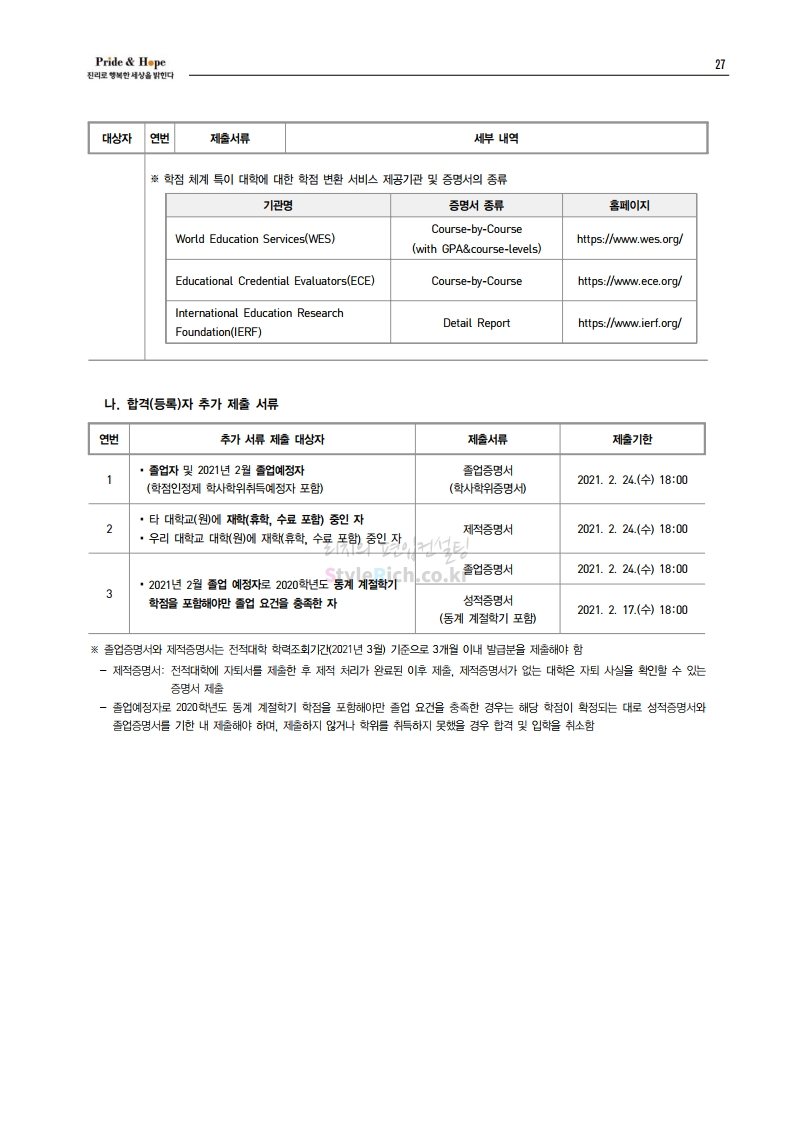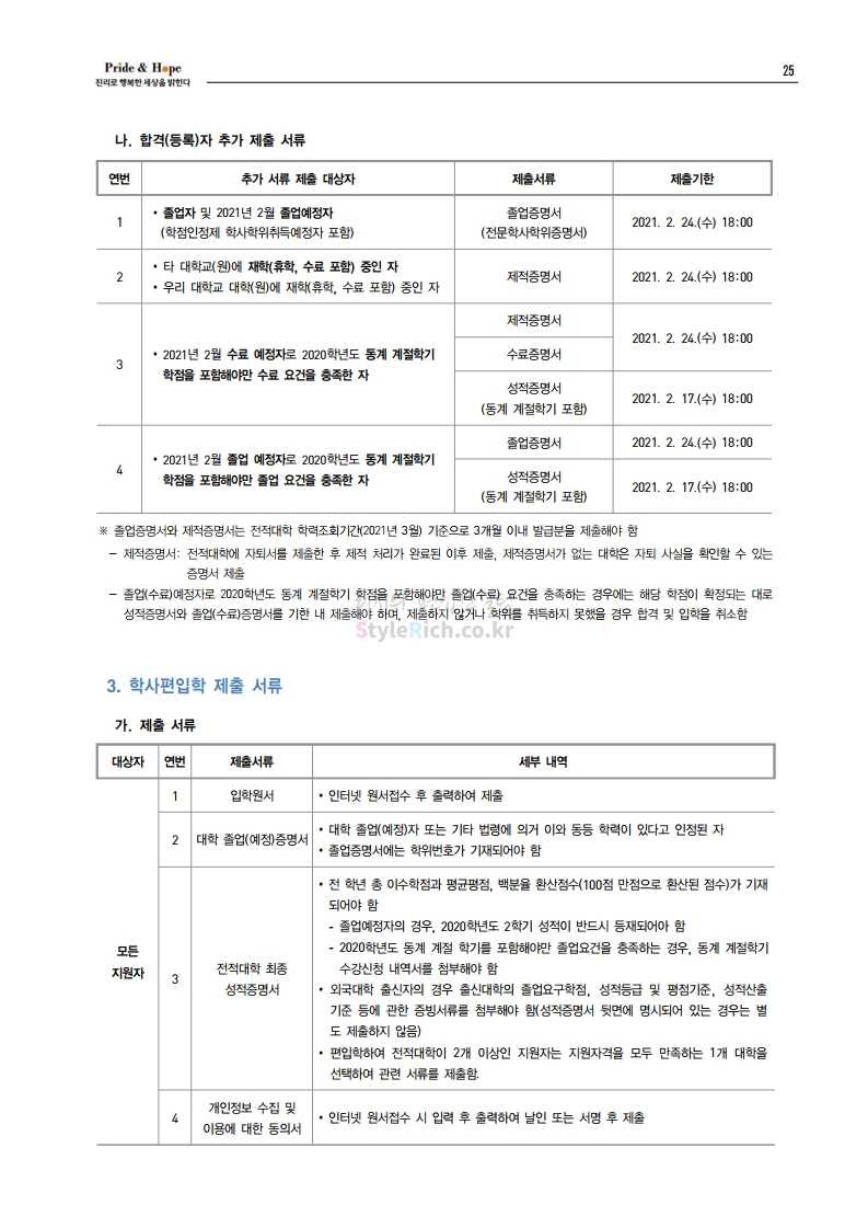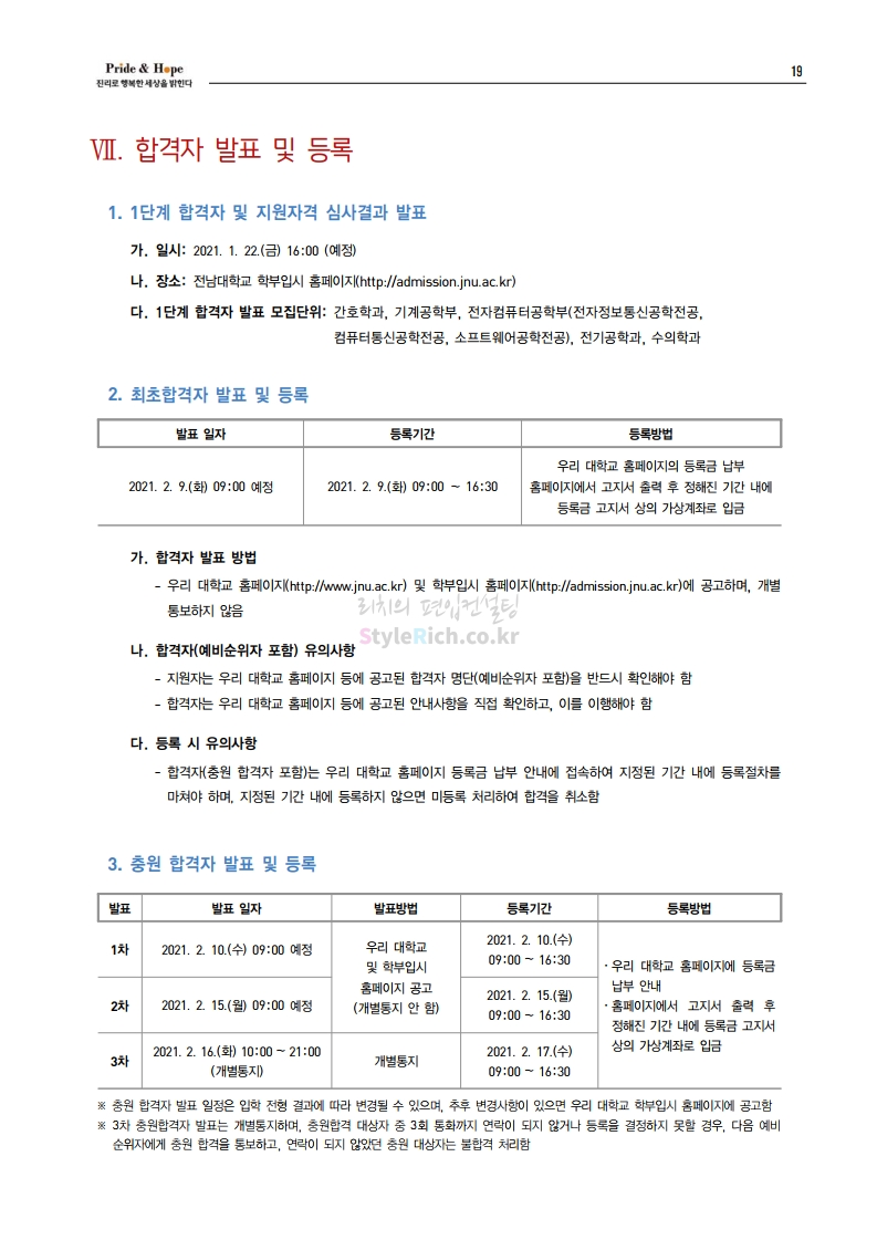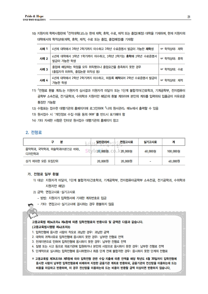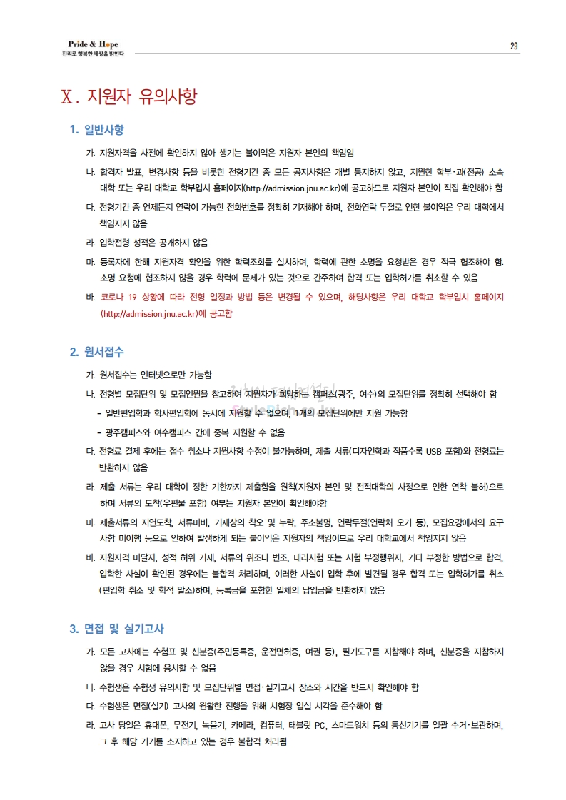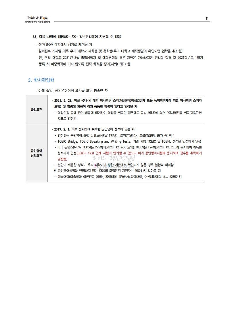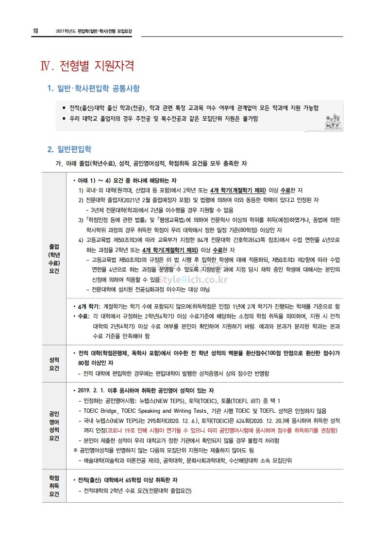 전남대 편입 2021학년도 모집요강 간편하게 보자! 2021.03.07 11:40 편입 모집요강/2021학년도 모집요강 2021학년도 전남대 편입 모집요강(2020.12.03 기준)을 간편하게 확인하세요. PC나 모바일에서 이미지를 클릭(터치) 후 이미지의 좌우측을 클릭(터치)하면 모집요강의 순서를 앞뒤로 넘길 수 있습니다. 좌측 클릭(터치)는 이전 페이지, 우측 클릭(터치)는 다음 페이지입니다. 2021학년도 전남대 편입 모집요강 다운받기 ☆ 2021학년도 편입학전형 모집요강-웹용-표준.pdf 3.44MB <출처: 전남대> [전남대학교]2021학년도 1학기 수업 방식이 궁금해요 공유하기 게시글 관리 리치의 편입컨설팅 저작자표시 비영리 변경금지 (새창열림) '편입 모집요강 > 2021학년도 모집요강' 카테고리의 다른 글 제주대 편입 2021학년도 모집요강 간편하게 보자! (0) 2021.03.07 전북대 편입 2021학년도 모집요강 간편하게 보자! (0) 2021.03.07 부산대 편입 2021학년도 모집요강 간편하게 보자! (0) 2021.03.07 경상대 편입 2021학년도 모집요강 간편하게 보자! (0) 2021.03.06 경북대 편입 2021학년도 모집요강 간편하게 보자! (0) 2021.03.04 댓글 공유하기 다른 글 댓글 이 글 공유하기 구독하기 구독하기 카카오톡 카카오톡 라인 라인 트위터 트위터 Facebook Facebook 카카오스토리 카카오스토리 밴드 밴드 네이버 블로그 네이버 블로그 Pocket Pocket Evernote Evernote 다른 글 제주대 편입 2021학년도 모집요강 간편하게 보자! 제주대 편입 2021학년도 모집요강 간편하게 보자! 2021.03.07 전북대 편입 2021학년도 모집요강 간편하게 보자! 전북대 편입 2021학년도 모집요강 간편하게 보자! 2021.03.07 부산대 편입 2021학년도 모집요강 간편하게 보자! 부산대 편입 2021학년도 모집요강 간편하게 보자! 2021.03.07 경상대 편입 2021학년도 모집요강 간편하게 보자! 경상대 편입 2021학년도 모집요강 간편하게 보자! 2021.03.06 다른 글 더 둘러보기