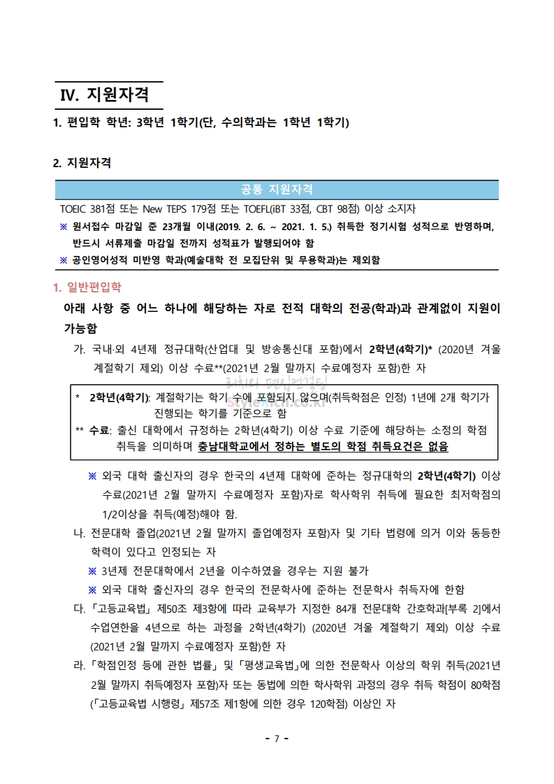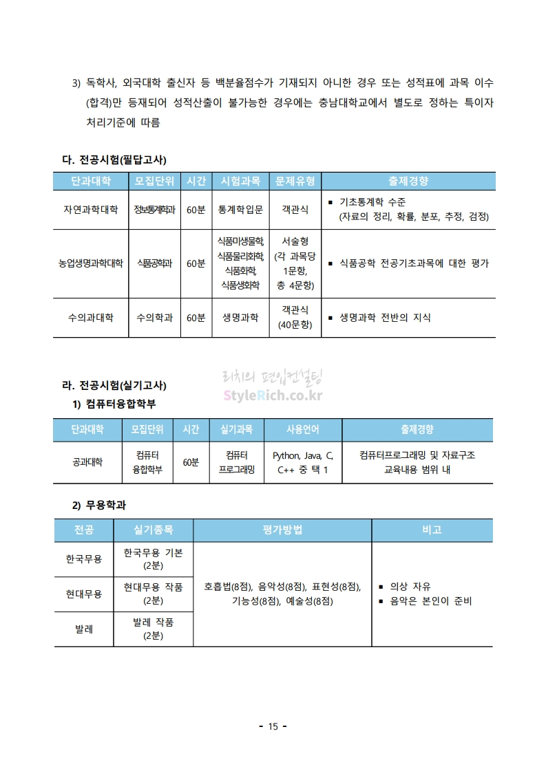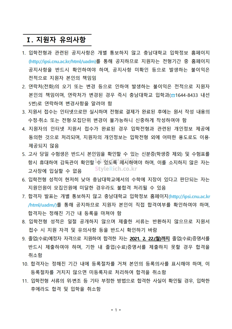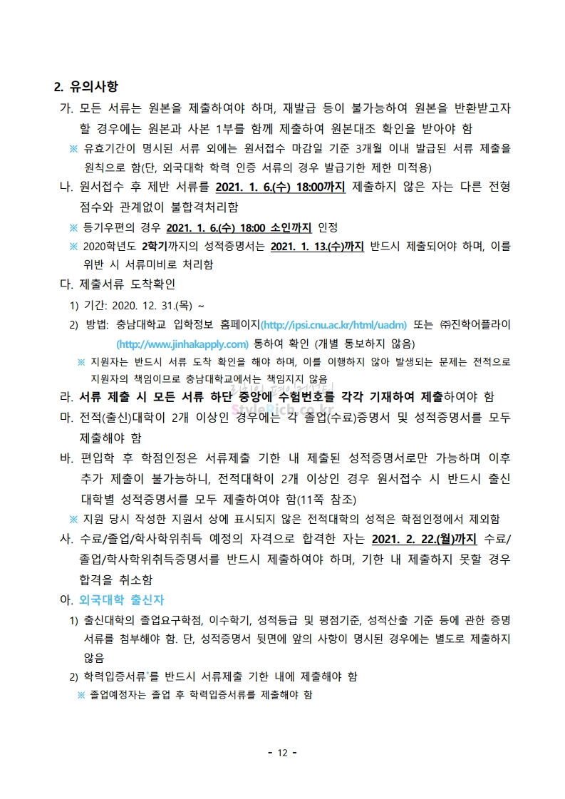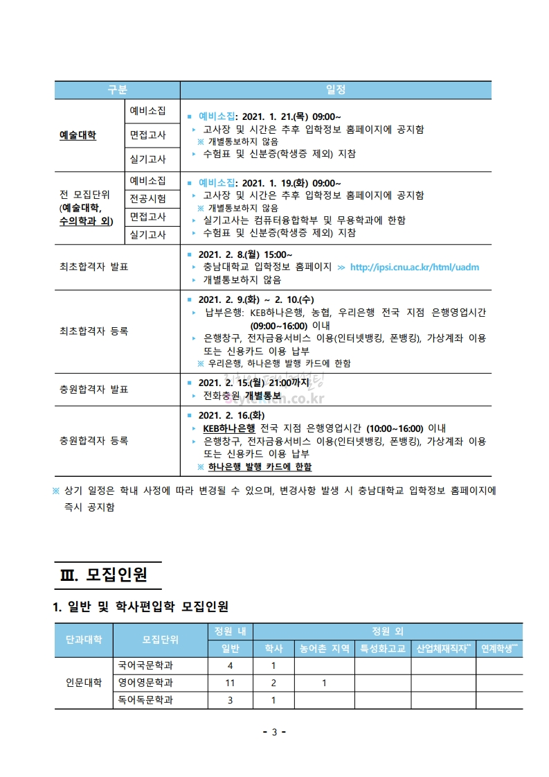충남대 편입 2021학년도 모집요강 간편하게 보자! 2021.03.08 22:07 편입 모집요강/2021학년도 모집요강 2021학년도 충남대 편입 모집요강(2020.12.11 기준)을 간편하게 확인하세요. PC나 모바일에서 이미지를 클릭(터치) 후 이미지의 좌우측을 클릭(터치)하면 모집요강의 순서를 앞뒤로 넘길 수 있습니다. 좌측 클릭(터치)는 이전 페이지, 우측 클릭(터치)는 다음 페이지입니다. 2021학년도 충남대 편입 모집요강 다운받기 2021학년도 편입학전형 모집요강.pdf 2.24MB <출처: 충남대> [충남대학교 Chungnam National University] 2021 충남대학교 홍보영상 Short ver. | CNU Makes the Future 공유하기 게시글 관리 리치의 편입컨설팅 저작자표시 비영리 변경금지 (새창열림) '편입 모집요강 > 2021학년도 모집요강' 카테고리의 다른 글 용인대 편입 2021학년도 모집요강 간편하게 보자! (0) 2021.05.09 충북대 편입 2021학년도 모집요강 간편하게 보자! (0) 2021.03.09 제주대 편입 2021학년도 모집요강 간편하게 보자! (0) 2021.03.07 전북대 편입 2021학년도 모집요강 간편하게 보자! (0) 2021.03.07 전남대 편입 2021학년도 모집요강 간편하게 보자! (0) 2021.03.07 댓글 공유하기 다른 글 댓글 이 글 공유하기 구독하기 구독하기 카카오톡 카카오톡 라인 라인 트위터 트위터 Facebook Facebook 카카오스토리 카카오스토리 밴드 밴드 네이버 블로그 네이버 블로그 Pocket Pocket Evernote Evernote 다른 글 용인대 편입 2021학년도 모집요강 간편하게 보자! 용인대 편입 2021학년도 모집요강 간편하게 보자! 2021.05.09 충북대 편입 2021학년도 모집요강 간편하게 보자! 충북대 편입 2021학년도 모집요강 간편하게 보자! 2021.03.09 제주대 편입 2021학년도 모집요강 간편하게 보자! 제주대 편입 2021학년도 모집요강 간편하게 보자! 2021.03.07 전북대 편입 2021학년도 모집요강 간편하게 보자! 전북대 편입 2021학년도 모집요강 간편하게 보자! 2021.03.07 다른 글 더 둘러보기
