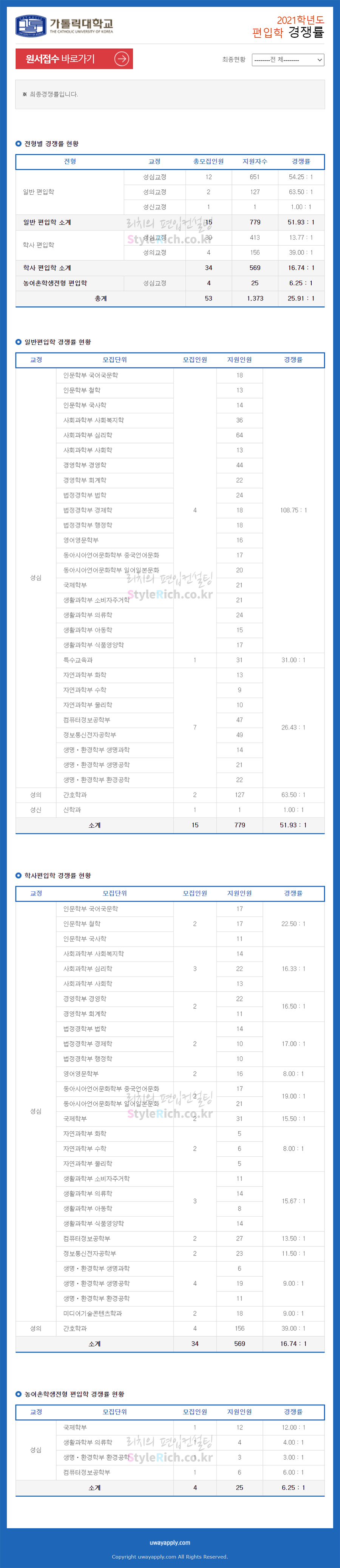 가톨릭대 편입 2021학년도 경쟁률 간편하게 보자! 2021.03.17 23:19 편입 경쟁률/2021학년도 경쟁률 2021학년도 가톨릭대 편입 경쟁률을 살펴보겠습니다. 일반편입, 학사편입, 농어촌학생전형 편입 순으로 경쟁률이 높습니다. 일반편입 내에서는 성의교정, 성심교정, 성신교정순으로 경쟁률이 높고 학사편입 내에서는 성의교정, 성신교정순으로 높습니다. 2021학년도 가톨릭대 편입 경쟁률 <출처: 유웨이 어플라이> [CUKFLIX] 20.5학번이지만 괜찮아 공유하기 게시글 관리 리치의 편입컨설팅 저작자표시 비영리 변경금지 (새창열림) '편입 경쟁률 > 2021학년도 경쟁률' 카테고리의 다른 글 경희대 편입 2021학년도 경쟁률을 간편하게 보자! (0) 2021.03.22 경기대 편입 2021학년도 경쟁률을 간편하게 보자! (0) 2021.03.21 건국대 편입 2021학년도 경쟁률을 간편하게 보자! (0) 2021.03.21 강남대 편입 2021학년도 경쟁률 간편하게 보자! (0) 2021.03.21 가천대 편입 2021학년도 경쟁률 간편하게 보자! (0) 2021.03.17 댓글 공유하기 다른 글 댓글 이 글 공유하기 구독하기 구독하기 카카오톡 카카오톡 라인 라인 트위터 트위터 Facebook Facebook 카카오스토리 카카오스토리 밴드 밴드 네이버 블로그 네이버 블로그 Pocket Pocket Evernote Evernote 다른 글 경기대 편입 2021학년도 경쟁률을 간편하게 보자! 경기대 편입 2021학년도 경쟁률을 간편하게 보자! 2021.03.21 건국대 편입 2021학년도 경쟁률을 간편하게 보자! 건국대 편입 2021학년도 경쟁률을 간편하게 보자! 2021.03.21 강남대 편입 2021학년도 경쟁률 간편하게 보자! 강남대 편입 2021학년도 경쟁률 간편하게 보자! 2021.03.21 가천대 편입 2021학년도 경쟁률 간편하게 보자! 가천대 편입 2021학년도 경쟁률 간편하게 보자! 2021.03.17 다른 글 더 둘러보기