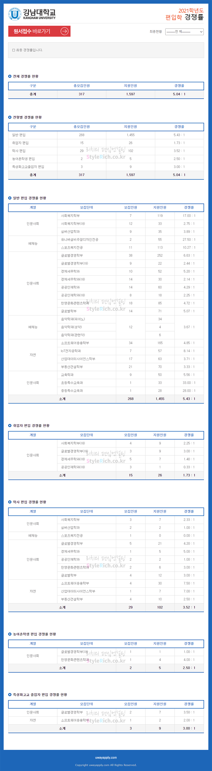 강남대 편입 2021학년도 경쟁률 간편하게 보자! 2021.03.21 13:59 편입 경쟁률/2021학년도 경쟁률 2021학년도 강남대 편입 경쟁률을 살펴보겠습니다. 2021학년도 강남대 편입 전형별 경쟁률 현황을 보면 일반편입, 학사편입, 특성화고교졸업자편입, 농어촌학생편입, 취업자편입 순으로 경쟁률이 높은 것을 확인할 수 있습니다. 2021학년도 강남대 편입 경쟁률 <출처: 유웨이 어플라이> (대학혁신지원사업)2020년 글로벌량강화 세계비정상회담_Highlight Ver. 공유하기 게시글 관리 리치의 편입컨설팅 저작자표시 비영리 변경금지 (새창열림) '편입 경쟁률 > 2021학년도 경쟁률' 카테고리의 다른 글 경희대 편입 2021학년도 경쟁률을 간편하게 보자! (0) 2021.03.22 경기대 편입 2021학년도 경쟁률을 간편하게 보자! (0) 2021.03.21 건국대 편입 2021학년도 경쟁률을 간편하게 보자! (0) 2021.03.21 가톨릭대 편입 2021학년도 경쟁률 간편하게 보자! (0) 2021.03.17 가천대 편입 2021학년도 경쟁률 간편하게 보자! (0) 2021.03.17 댓글 공유하기 다른 글 댓글 이 글 공유하기 구독하기 구독하기 카카오톡 카카오톡 라인 라인 트위터 트위터 Facebook Facebook 카카오스토리 카카오스토리 밴드 밴드 네이버 블로그 네이버 블로그 Pocket Pocket Evernote Evernote 다른 글 경기대 편입 2021학년도 경쟁률을 간편하게 보자! 경기대 편입 2021학년도 경쟁률을 간편하게 보자! 2021.03.21 건국대 편입 2021학년도 경쟁률을 간편하게 보자! 건국대 편입 2021학년도 경쟁률을 간편하게 보자! 2021.03.21 가톨릭대 편입 2021학년도 경쟁률 간편하게 보자! 가톨릭대 편입 2021학년도 경쟁률 간편하게 보자! 2021.03.17 가천대 편입 2021학년도 경쟁률 간편하게 보자! 가천대 편입 2021학년도 경쟁률 간편하게 보자! 2021.03.17 다른 글 더 둘러보기