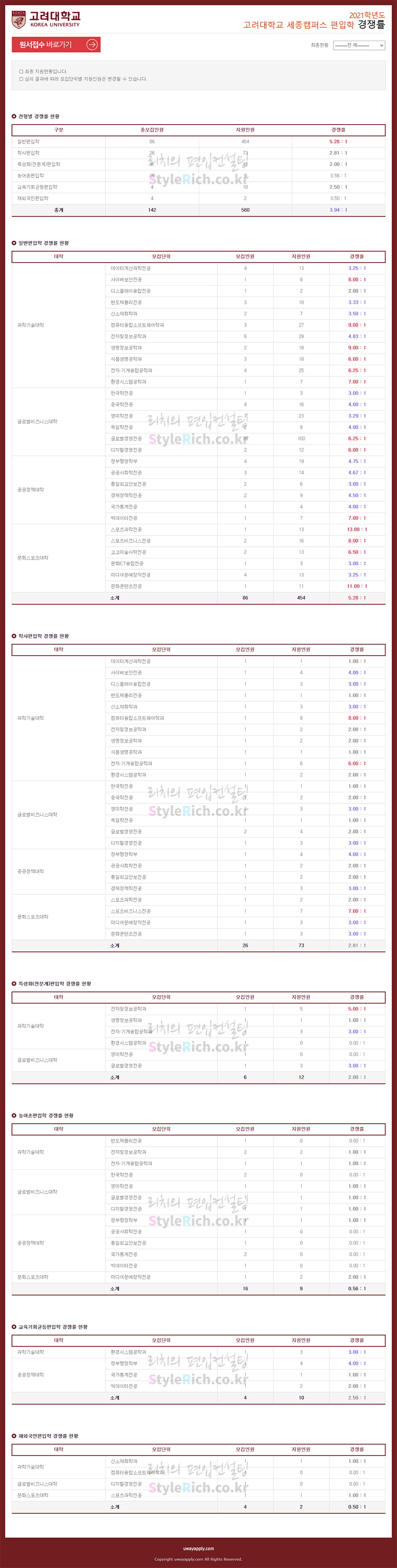 고려대(세종) 편입 2021학년도 경쟁률을 간편하게 보자! 2021.03.23 22:46 편입 경쟁률/2021학년도 경쟁률 2021학년도 고려대(세종) 편입 경쟁률을 살펴보겠습니다. 2021학년도 고려대(세종) 편입 전형별 경쟁률 현황을 보면 일반편입, 학사편입, 교육기회균등편입, 특성화(전문계)편입, 농어촌편입, 재외국민편입 순으로 경쟁률이 높은 것을 확인할 수 있습니다. 고려대(세종) 편입 경쟁률 <출처: 유웨이 어플라이> [고려대학교 세종캠퍼스]2021 KU세종 홍보영상_국문 공유하기 게시글 관리 리치의 편입컨설팅 저작자표시 비영리 변경금지 (새창열림) '편입 경쟁률 > 2021학년도 경쟁률' 카테고리의 다른 글 광운대 편입 2021학년도 경쟁률을 간편하게 보자! (0) 2021.03.25 고려대 편입 2021학년도 경쟁률을 간편하게 보자! (0) 2021.03.24 경희대 편입 2021학년도 경쟁률을 간편하게 보자! (0) 2021.03.22 경기대 편입 2021학년도 경쟁률을 간편하게 보자! (0) 2021.03.21 건국대 편입 2021학년도 경쟁률을 간편하게 보자! (0) 2021.03.21 댓글 공유하기 다른 글 댓글 이 글 공유하기 구독하기 구독하기 카카오톡 카카오톡 라인 라인 트위터 트위터 Facebook Facebook 카카오스토리 카카오스토리 밴드 밴드 네이버 블로그 네이버 블로그 Pocket Pocket Evernote Evernote 다른 글 광운대 편입 2021학년도 경쟁률을 간편하게 보자! 광운대 편입 2021학년도 경쟁률을 간편하게 보자! 2021.03.25 고려대 편입 2021학년도 경쟁률을 간편하게 보자! 고려대 편입 2021학년도 경쟁률을 간편하게 보자! 2021.03.24 경희대 편입 2021학년도 경쟁률을 간편하게 보자! 경희대 편입 2021학년도 경쟁률을 간편하게 보자! 2021.03.22 경기대 편입 2021학년도 경쟁률을 간편하게 보자! 경기대 편입 2021학년도 경쟁률을 간편하게 보자! 2021.03.21 다른 글 더 둘러보기