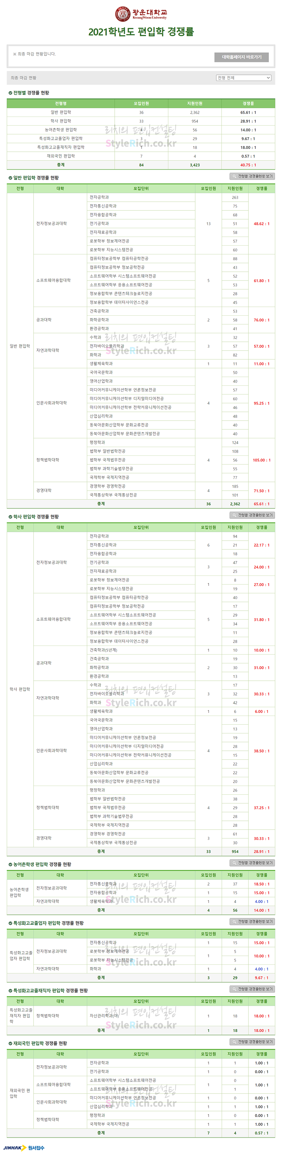 광운대 편입 2021학년도 경쟁률을 간편하게 보자! 2021.03.25 07:08 편입 경쟁률/2021학년도 경쟁률 2021학년도 광운대 편입 경쟁률을 살펴보겠습니다. 2021학년도 광운대 편입 전형별 경쟁률 현황을 보면 일반편입, 학사편입, 특성화고교졸재직자편입, 농어촌학생편입, 특성화고교졸업자편입, 재외국민편입 순으로 경쟁률이 높습니다. <출처: 진학사 원서접수> [광운뉴스 207회] ❄️광운 썰매장❄️ 슬기로운 광운대학교 기숙사 생활! #광운대학교 #광운썰매장 공유하기 게시글 관리 리치의 편입컨설팅 저작자표시 비영리 변경금지 (새창열림) '편입 경쟁률 > 2021학년도 경쟁률' 카테고리의 다른 글 단국대 편입 2021학년도 경쟁률을 간편하게 보자! (0) 2021.03.26 국민대 편입 2021학년도 경쟁률을 간편하게 보자! (0) 2021.03.25 고려대 편입 2021학년도 경쟁률을 간편하게 보자! (0) 2021.03.24 고려대(세종) 편입 2021학년도 경쟁률을 간편하게 보자! (0) 2021.03.23 경희대 편입 2021학년도 경쟁률을 간편하게 보자! (0) 2021.03.22 댓글 공유하기 다른 글 댓글 이 글 공유하기 구독하기 구독하기 카카오톡 카카오톡 라인 라인 트위터 트위터 Facebook Facebook 카카오스토리 카카오스토리 밴드 밴드 네이버 블로그 네이버 블로그 Pocket Pocket Evernote Evernote 다른 글 단국대 편입 2021학년도 경쟁률을 간편하게 보자! 단국대 편입 2021학년도 경쟁률을 간편하게 보자! 2021.03.26 국민대 편입 2021학년도 경쟁률을 간편하게 보자! 국민대 편입 2021학년도 경쟁률을 간편하게 보자! 2021.03.25 고려대 편입 2021학년도 경쟁률을 간편하게 보자! 고려대 편입 2021학년도 경쟁률을 간편하게 보자! 2021.03.24 고려대(세종) 편입 2021학년도 경쟁률을 간편하게 보자! 고려대(세종) 편입 2021학년도 경쟁률을 간편하게 보자! 2021.03.23 다른 글 더 둘러보기