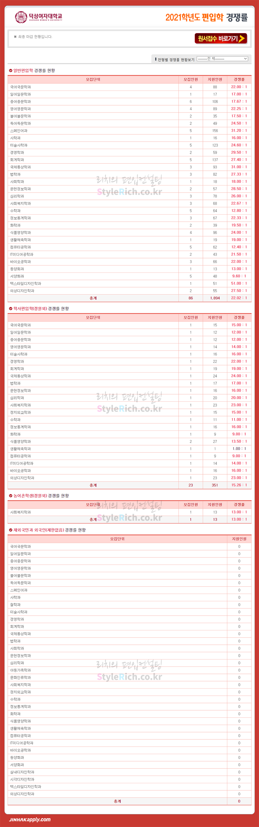 덕성여대 편입 2021학년도 경쟁률을 간편하게 보자! 2021.03.27 08:35 편입 경쟁률/2021학년도 경쟁률 2021학년도 덕성여대 편입 경쟁률을 살펴보겠습니다. 2021학년도 덕성여대 편입 전형별 경쟁률 현황을 보면 일반편입, 학사편입, 농어촌학생편입 순으로 경쟁률이 높습니다. 2021학년도 덕성여대 편입 경쟁률 <출처: 진학사 어플라이> 덕성여대 굿즈 언박싱2(feat.덕새) 공유하기 게시글 관리 리치의 편입컨설팅 저작자표시 비영리 변경금지 (새창열림) '편입 경쟁률 > 2021학년도 경쟁률' 카테고리의 다른 글 동덕여대 편입 2021학년도 경쟁률을 간편하게 보자! (0) 2021.03.28 동국대 편입 2021학년도 경쟁률을 간편하게 보자! (0) 2021.03.27 단국대 편입 2021학년도 경쟁률을 간편하게 보자! (0) 2021.03.26 국민대 편입 2021학년도 경쟁률을 간편하게 보자! (0) 2021.03.25 광운대 편입 2021학년도 경쟁률을 간편하게 보자! (0) 2021.03.25 댓글 공유하기 다른 글 댓글 이 글 공유하기 구독하기 구독하기 카카오톡 카카오톡 라인 라인 트위터 트위터 Facebook Facebook 카카오스토리 카카오스토리 밴드 밴드 네이버 블로그 네이버 블로그 Pocket Pocket Evernote Evernote 다른 글 동덕여대 편입 2021학년도 경쟁률을 간편하게 보자! 동덕여대 편입 2021학년도 경쟁률을 간편하게 보자! 2021.03.28 동국대 편입 2021학년도 경쟁률을 간편하게 보자! 동국대 편입 2021학년도 경쟁률을 간편하게 보자! 2021.03.27 단국대 편입 2021학년도 경쟁률을 간편하게 보자! 단국대 편입 2021학년도 경쟁률을 간편하게 보자! 2021.03.26 국민대 편입 2021학년도 경쟁률을 간편하게 보자! 국민대 편입 2021학년도 경쟁률을 간편하게 보자! 2021.03.25 다른 글 더 둘러보기