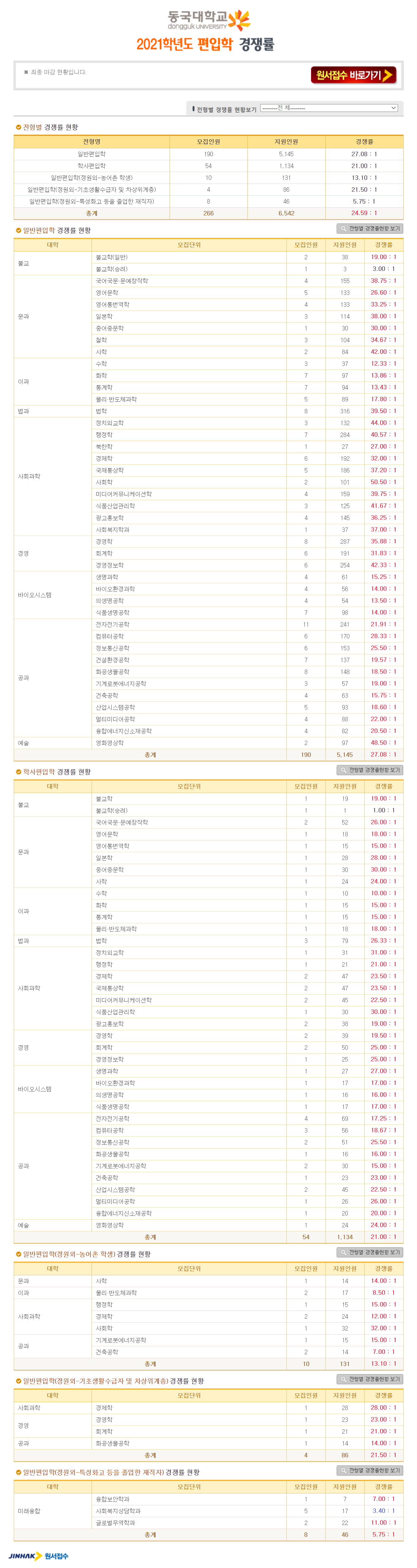 동국대 편입 2021학년도 경쟁률을 간편하게 보자! 2021.03.27 16:21 편입 경쟁률/2021학년도 경쟁률 2021학년도 동국대 편입 경쟁률을 살펴보겠습니다. 2021학년도 동국대 편입 전형별 경쟁률 현황을 보면 일반편입, 기초생활수급자 및 차상위계층편입, 학사편입, 농어촌학생편입, 특성화고 등을 졸업한 재직자편입 순으로 경쟁률이 높습니다. 2021학년도 동국대 편입 경쟁률 <출처: 진학사 원서접수> 동국대 홍보대사 동감과 떠나는 캠퍼스투어 공유하기 게시글 관리 리치의 편입컨설팅 저작자표시 비영리 변경금지 (새창열림) '편입 경쟁률 > 2021학년도 경쟁률' 카테고리의 다른 글 명지대 편입 2021학년도 경쟁률을 간편하게 보자! (0) 2021.03.28 동덕여대 편입 2021학년도 경쟁률을 간편하게 보자! (0) 2021.03.28 덕성여대 편입 2021학년도 경쟁률을 간편하게 보자! (0) 2021.03.27 단국대 편입 2021학년도 경쟁률을 간편하게 보자! (0) 2021.03.26 국민대 편입 2021학년도 경쟁률을 간편하게 보자! (0) 2021.03.25 댓글 공유하기 다른 글 댓글 이 글 공유하기 구독하기 구독하기 카카오톡 카카오톡 라인 라인 트위터 트위터 Facebook Facebook 카카오스토리 카카오스토리 밴드 밴드 네이버 블로그 네이버 블로그 Pocket Pocket Evernote Evernote 다른 글 명지대 편입 2021학년도 경쟁률을 간편하게 보자! 명지대 편입 2021학년도 경쟁률을 간편하게 보자! 2021.03.28 동덕여대 편입 2021학년도 경쟁률을 간편하게 보자! 동덕여대 편입 2021학년도 경쟁률을 간편하게 보자! 2021.03.28 덕성여대 편입 2021학년도 경쟁률을 간편하게 보자! 덕성여대 편입 2021학년도 경쟁률을 간편하게 보자! 2021.03.27 단국대 편입 2021학년도 경쟁률을 간편하게 보자! 단국대 편입 2021학년도 경쟁률을 간편하게 보자! 2021.03.26 다른 글 더 둘러보기