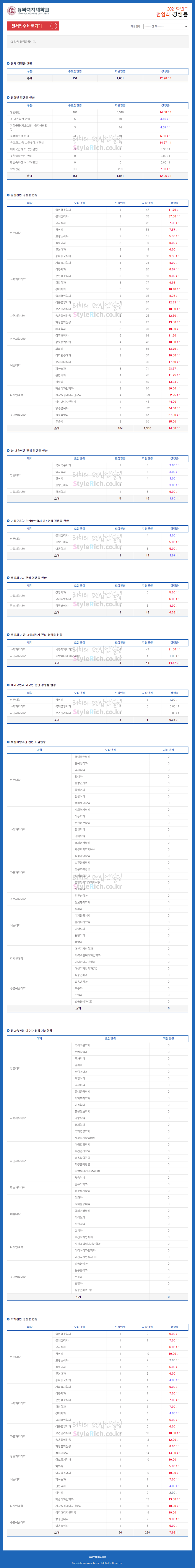 동덕여대 편입 2021학년도 경쟁률을 간편하게 보자! 2021.03.28 00:30 편입 경쟁률/2021학년도 경쟁률 2021학년도 동덕여대 편입 경쟁률을 살펴보겠습니다. 2021학년도 동덕여대 편입 전형별 경쟁률 현황을 보면 특성화고 등 고졸재직자편입, 일반편입, 학사편입, 특성화고교편입, 기회균등편입, 농어촌학생편입, 재외국민과 외국인편입 순으로 경쟁률이 높습니다. 2021학년도 동덕여대 편입 경쟁률 <출처: 유웨이 어플라이> [홍보대사][동그라미] 동덕르네상스홀 솜이 아트샵 다들 가보셨나요? 함께 가보시죠! :) 공유하기 게시글 관리 리치의 편입컨설팅 저작자표시 비영리 변경금지 (새창열림) '편입 경쟁률 > 2021학년도 경쟁률' 카테고리의 다른 글 삼육대 편입 2021학년도 경쟁률을 간편하게 보자! (0) 2021.03.28 명지대 편입 2021학년도 경쟁률을 간편하게 보자! (0) 2021.03.28 동국대 편입 2021학년도 경쟁률을 간편하게 보자! (0) 2021.03.27 덕성여대 편입 2021학년도 경쟁률을 간편하게 보자! (0) 2021.03.27 단국대 편입 2021학년도 경쟁률을 간편하게 보자! (0) 2021.03.26 댓글 공유하기 다른 글 댓글 이 글 공유하기 구독하기 구독하기 카카오톡 카카오톡 라인 라인 트위터 트위터 Facebook Facebook 카카오스토리 카카오스토리 밴드 밴드 네이버 블로그 네이버 블로그 Pocket Pocket Evernote Evernote 다른 글 삼육대 편입 2021학년도 경쟁률을 간편하게 보자! 삼육대 편입 2021학년도 경쟁률을 간편하게 보자! 2021.03.28 명지대 편입 2021학년도 경쟁률을 간편하게 보자! 명지대 편입 2021학년도 경쟁률을 간편하게 보자! 2021.03.28 동국대 편입 2021학년도 경쟁률을 간편하게 보자! 동국대 편입 2021학년도 경쟁률을 간편하게 보자! 2021.03.27 덕성여대 편입 2021학년도 경쟁률을 간편하게 보자! 덕성여대 편입 2021학년도 경쟁률을 간편하게 보자! 2021.03.27 다른 글 더 둘러보기