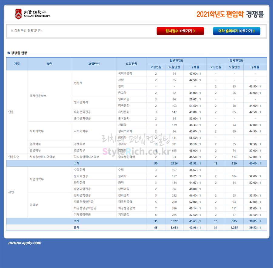 서강대 편입 2021학년도 경쟁률을 간편하게 보자! 2021.03.30 23:38 편입 경쟁률/2021학년도 경쟁률 2021학년도 서강대 편입 경쟁률을 살펴보겠습니다. 2021학년도 서강대 편입 전형별 경쟁률 현황을 보면 일반편입, 학사편입 순으로 경쟁률이 높습니다. 2021학년도 서강대 편입 경쟁률 <출처: 진학사 원서접수> 새내기를 위한 서강캠퍼스 사용설명서(feat. 새맞단, 깨알 팁 대 방출!!) 공유하기 게시글 관리 리치의 편입컨설팅 저작자표시 비영리 변경금지 (새창열림) '편입 경쟁률 > 2021학년도 경쟁률' 카테고리의 다른 글 서울과학기술대 편입 2021학년도 경쟁률을 간편하게 보자! (0) 2021.04.01 서경대 편입 2021학년도 경쟁률을 간편하게 보자! (0) 2021.03.31 상명대(천안) 편입 2021학년도 경쟁률을 간편하게 보자! (0) 2021.03.29 상명대 편입 2021학년도 경쟁률을 간편하게 보자! (0) 2021.03.28 삼육대 편입 2021학년도 경쟁률을 간편하게 보자! (0) 2021.03.28 댓글 공유하기 다른 글 댓글 이 글 공유하기 구독하기 구독하기 카카오톡 카카오톡 라인 라인 트위터 트위터 Facebook Facebook 카카오스토리 카카오스토리 밴드 밴드 네이버 블로그 네이버 블로그 Pocket Pocket Evernote Evernote 다른 글 서울과학기술대 편입 2021학년도 경쟁률을 간편하게 보자! 서울과학기술대 편입 2021학년도 경쟁률을 간편하게 보자! 2021.04.01 서경대 편입 2021학년도 경쟁률을 간편하게 보자! 서경대 편입 2021학년도 경쟁률을 간편하게 보자! 2021.03.31 상명대(천안) 편입 2021학년도 경쟁률을 간편하게 보자! 상명대(천안) 편입 2021학년도 경쟁률을 간편하게 보자! 2021.03.29 상명대 편입 2021학년도 경쟁률을 간편하게 보자! 상명대 편입 2021학년도 경쟁률을 간편하게 보자! 2021.03.28 다른 글 더 둘러보기