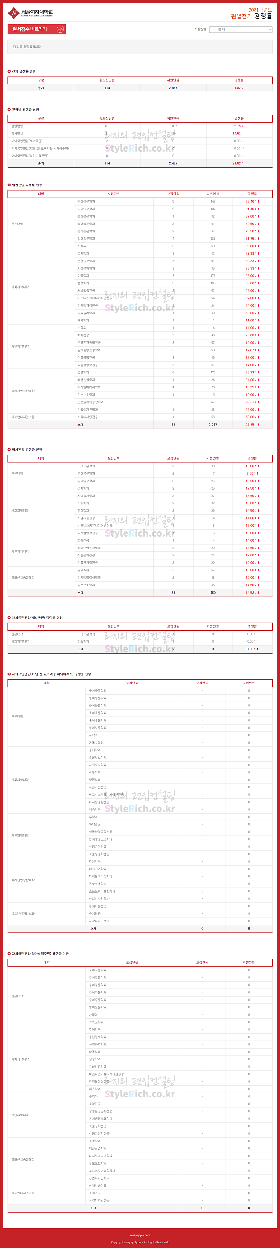 서울여대 편입 2021학년도 경쟁률을 간편하게 보자! 2021.04.04 17:49 편입 경쟁률/2021학년도 경쟁률 2021학년도 서울여대 편입 경쟁률을 살펴보겠습니다. 2021학년도 서울여대 편입 전형별 경쟁률 현황을 보면 일반편입, 학사편입 순으로 경쟁률이 높습니다. 2021학년도 서울여대 편입 경쟁률 <출처: 유웨이 어플라이> [홍보바롬이] 서울여자대학교 주변 맛집이 궁금하다면?🥘🍣 공유하기 게시글 관리 리치의 편입컨설팅 저작자표시 비영리 변경금지 (새창열림) '편입 경쟁률 > 2021학년도 경쟁률' 카테고리의 다른 글 성신여대 편입 2021학년도 경쟁률을 간편하게 보자! (0) 2021.04.05 성균관대 편입 2021학년도 경쟁률을 간편하게 보자! (0) 2021.04.04 서울시립대 편입 2021학년도 경쟁률을 간편하게 보자! (0) 2021.04.03 서울대 편입 2021학년도 경쟁률을 간편하게 보자! (0) 2021.04.03 서울과학기술대 편입 2021학년도 경쟁률을 간편하게 보자! (0) 2021.04.01 댓글 공유하기 다른 글 댓글 이 글 공유하기 구독하기 구독하기 카카오톡 카카오톡 라인 라인 트위터 트위터 Facebook Facebook 카카오스토리 카카오스토리 밴드 밴드 네이버 블로그 네이버 블로그 Pocket Pocket Evernote Evernote 다른 글 성신여대 편입 2021학년도 경쟁률을 간편하게 보자! 성신여대 편입 2021학년도 경쟁률을 간편하게 보자! 2021.04.05 성균관대 편입 2021학년도 경쟁률을 간편하게 보자! 성균관대 편입 2021학년도 경쟁률을 간편하게 보자! 2021.04.04 서울시립대 편입 2021학년도 경쟁률을 간편하게 보자! 서울시립대 편입 2021학년도 경쟁률을 간편하게 보자! 2021.04.03 서울대 편입 2021학년도 경쟁률을 간편하게 보자! 서울대 편입 2021학년도 경쟁률을 간편하게 보자! 2021.04.03 다른 글 더 둘러보기