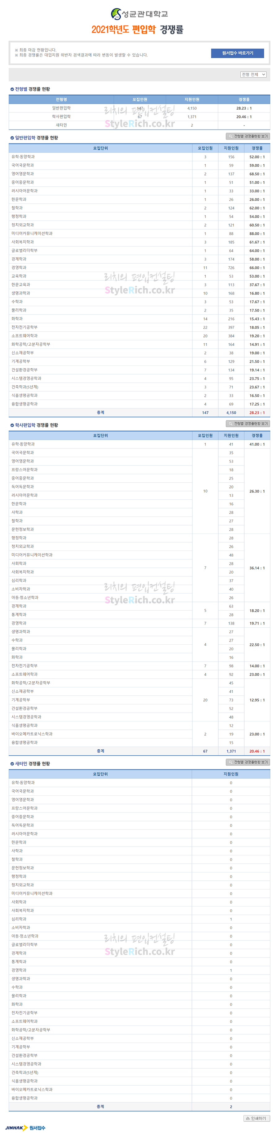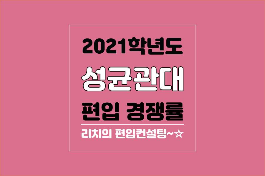 성균관대 편입 2021학년도 경쟁률을 간편하게 보자! 2021.04.04 21:32 편입 경쟁률/2021학년도 경쟁률 2021학년도 성균관대 편입 경쟁률을 살펴보겠습니다. 2021학년도 성균관대 편입 전형별 경쟁률 현황을 보면 일반편입, 학사편입 순으로 경쟁률이 높습니다. 2021학년도 성균관대 편입 경쟁률 <출처: 진학사 원서접수> 명륜이♥율전이, 우리 헤어졌어요... 김연우 이별택시 MV - (feat. 이별셔틀) 공유하기 게시글 관리 리치의 편입컨설팅 저작자표시 비영리 변경금지 (새창열림) '편입 경쟁률 > 2021학년도 경쟁률' 카테고리의 다른 글 세종대 편입 2021학년도 경쟁률을 간편하게 보자! (0) 2021.04.05 성신여대 편입 2021학년도 경쟁률을 간편하게 보자! (0) 2021.04.05 서울여대 편입 2021학년도 경쟁률을 간편하게 보자! (0) 2021.04.04 서울시립대 편입 2021학년도 경쟁률을 간편하게 보자! (0) 2021.04.03 서울대 편입 2021학년도 경쟁률을 간편하게 보자! (0) 2021.04.03 댓글 공유하기 다른 글 댓글 이 글 공유하기 구독하기 구독하기 카카오톡 카카오톡 라인 라인 트위터 트위터 Facebook Facebook 카카오스토리 카카오스토리 밴드 밴드 네이버 블로그 네이버 블로그 Pocket Pocket Evernote Evernote 다른 글 세종대 편입 2021학년도 경쟁률을 간편하게 보자! 세종대 편입 2021학년도 경쟁률을 간편하게 보자! 2021.04.05 성신여대 편입 2021학년도 경쟁률을 간편하게 보자! 성신여대 편입 2021학년도 경쟁률을 간편하게 보자! 2021.04.05 서울여대 편입 2021학년도 경쟁률을 간편하게 보자! 서울여대 편입 2021학년도 경쟁률을 간편하게 보자! 2021.04.04 서울시립대 편입 2021학년도 경쟁률을 간편하게 보자! 서울시립대 편입 2021학년도 경쟁률을 간편하게 보자! 2021.04.03 다른 글 더 둘러보기