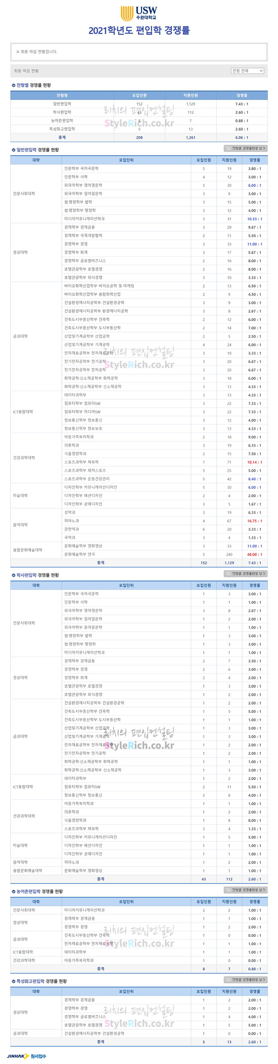 수원대 편입 2021학년도 경쟁률을 간편하게 보자! 2021.04.06 23:59 편입 경쟁률/2021학년도 경쟁률 2021학년도 수원대 편입 경쟁률을 살펴보겠습니다. 2021학년도 수원대 편입 전형별 경쟁률 현황을 보면 일반편입, 학사편입, 특성화고편입, 농어촌편입 순으로 경쟁률이 높습니다. 2021학년도 수원대 편입경쟁률 <출처: 진학사 원서접수> [신입생OT] 신입생을 위한 학교생활안내 공유하기 게시글 관리 리치의 편입컨설팅 저작자표시 비영리 변경금지 (새창열림) '편입 경쟁률 > 2021학년도 경쟁률' 카테고리의 다른 글 숭실대 편입 2021학년도 경쟁률을 간편하게 보자! (0) 2021.04.08 숙명여대 편입 2021학년도 경쟁률을 간편하게 보자! (0) 2021.04.07 세종대 편입 2021학년도 경쟁률을 간편하게 보자! (0) 2021.04.05 성신여대 편입 2021학년도 경쟁률을 간편하게 보자! (0) 2021.04.05 성균관대 편입 2021학년도 경쟁률을 간편하게 보자! (0) 2021.04.04 댓글 공유하기 다른 글 댓글 이 글 공유하기 구독하기 구독하기 카카오톡 카카오톡 라인 라인 트위터 트위터 Facebook Facebook 카카오스토리 카카오스토리 밴드 밴드 네이버 블로그 네이버 블로그 Pocket Pocket Evernote Evernote 다른 글 숭실대 편입 2021학년도 경쟁률을 간편하게 보자! 숭실대 편입 2021학년도 경쟁률을 간편하게 보자! 2021.04.08 숙명여대 편입 2021학년도 경쟁률을 간편하게 보자! 숙명여대 편입 2021학년도 경쟁률을 간편하게 보자! 2021.04.07 세종대 편입 2021학년도 경쟁률을 간편하게 보자! 세종대 편입 2021학년도 경쟁률을 간편하게 보자! 2021.04.05 성신여대 편입 2021학년도 경쟁률을 간편하게 보자! 성신여대 편입 2021학년도 경쟁률을 간편하게 보자! 2021.04.05 다른 글 더 둘러보기