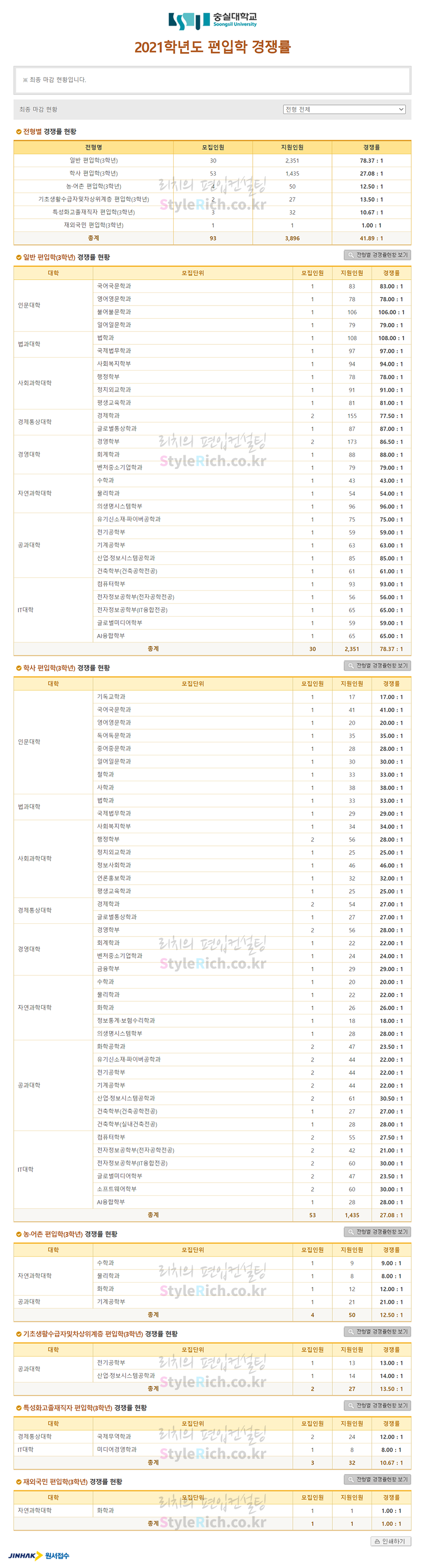 숭실대 편입 2021학년도 경쟁률을 간편하게 보자! 2021.04.08 23:41 편입 경쟁률/2021학년도 경쟁률 2021학년도 숭실대 편입 경쟁률을 살펴보겠습니다. 2021학년도 숭실대 편입 전형별 경쟁률 현황을 보면 일반편입, 학사편입, 기초생활수급자및차상위계층편입, 농어촌편입, 특성화고졸재직자편입, 재외국민편입 순으로 경쟁률이 높습니다. 2021학년도 숭실대 편입 경쟁률 <출처: 진학사 원서접수> ⭐걷지 말고 뛰어라🏃♂, 런닝슝-1편⭐ 공유하기 게시글 관리 리치의 편입컨설팅 저작자표시 비영리 변경금지 (새창열림) '편입 경쟁률 > 2021학년도 경쟁률' 카테고리의 다른 글 안양대 편입 2021학년도 경쟁률 간편하게 보자! (0) 2021.04.11 아주대 편입 2021학년도 경쟁률을 간편하게 보자! (0) 2021.04.09 숙명여대 편입 2021학년도 경쟁률을 간편하게 보자! (0) 2021.04.07 수원대 편입 2021학년도 경쟁률을 간편하게 보자! (0) 2021.04.06 세종대 편입 2021학년도 경쟁률을 간편하게 보자! (0) 2021.04.05 댓글 공유하기 다른 글 댓글 이 글 공유하기 구독하기 구독하기 카카오톡 카카오톡 라인 라인 트위터 트위터 Facebook Facebook 카카오스토리 카카오스토리 밴드 밴드 네이버 블로그 네이버 블로그 Pocket Pocket Evernote Evernote 다른 글 안양대 편입 2021학년도 경쟁률 간편하게 보자! 안양대 편입 2021학년도 경쟁률 간편하게 보자! 2021.04.11 아주대 편입 2021학년도 경쟁률을 간편하게 보자! 아주대 편입 2021학년도 경쟁률을 간편하게 보자! 2021.04.09 숙명여대 편입 2021학년도 경쟁률을 간편하게 보자! 숙명여대 편입 2021학년도 경쟁률을 간편하게 보자! 2021.04.07 수원대 편입 2021학년도 경쟁률을 간편하게 보자! 수원대 편입 2021학년도 경쟁률을 간편하게 보자! 2021.04.06 다른 글 더 둘러보기