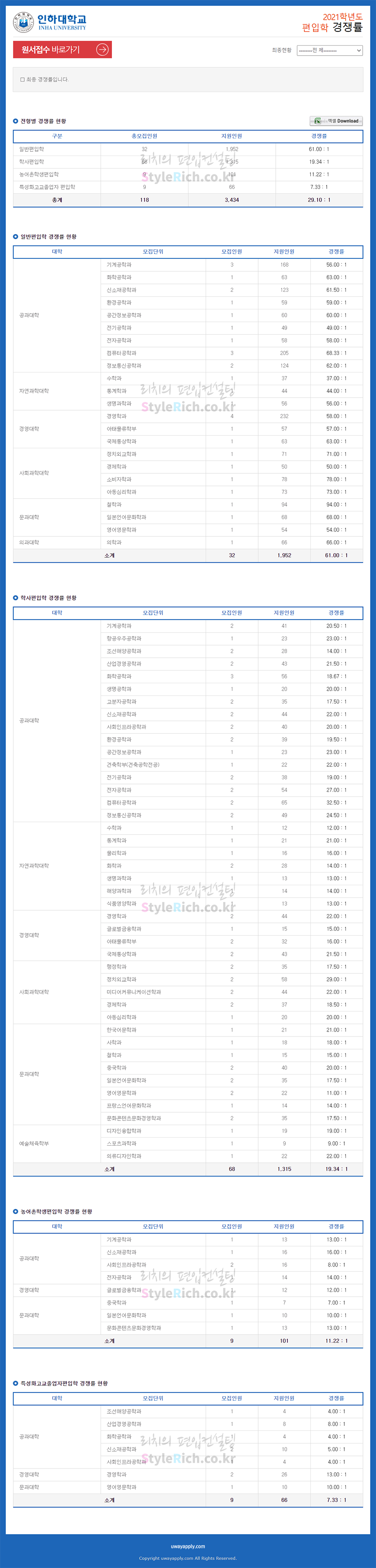 인하대 편입 2021학년도 경쟁률을 간편하게 보자! 2021.04.13 22:28 편입 경쟁률/2021학년도 경쟁률 2021학년도 인하대 편입 경쟁률을 살펴보겠습니다. 2021학년도 인하대 편입 전형별 경쟁률 현황을 보면 일반편입, 학사편입, 농어촌학생편입, 특성화고교졸업자편입 순으로 경쟁률이 높습니다. 2021학년도 인하대 편입 경쟁률 <출처: 유웨이 어플라이> [인하대] 전지적 인하시점, 당신의 K MOOC를 추천해드립니다! 공유하기 게시글 관리 리치의 편입컨설팅 저작자표시 비영리 변경금지 (새창열림) '편입 경쟁률 > 2021학년도 경쟁률' 카테고리의 다른 글 한국산업기술대 편입 2021학년도 경쟁률을 간편하게 보자! (0) 2021.04.15 중앙대 편입 2021학년도 경쟁률을 간편하게 보자! (0) 2021.04.14 인천대 편입 2021학년도 경쟁률을 간편하게 보자! (0) 2021.04.12 이화여대 편입 2021학년도 경쟁률을 간편하게 보자! (0) 2021.04.11 연세대 편입 2021학년도 경쟁률을 간편하게 보자! (0) 2021.04.11 댓글 공유하기 다른 글 댓글 이 글 공유하기 구독하기 구독하기 카카오톡 카카오톡 라인 라인 트위터 트위터 Facebook Facebook 카카오스토리 카카오스토리 밴드 밴드 네이버 블로그 네이버 블로그 Pocket Pocket Evernote Evernote 다른 글 한국산업기술대 편입 2021학년도 경쟁률을 간편하게 보자! 한국산업기술대 편입 2021학년도 경쟁률을 간편하게 보자! 2021.04.15 중앙대 편입 2021학년도 경쟁률을 간편하게 보자! 중앙대 편입 2021학년도 경쟁률을 간편하게 보자! 2021.04.14 인천대 편입 2021학년도 경쟁률을 간편하게 보자! 인천대 편입 2021학년도 경쟁률을 간편하게 보자! 2021.04.12 이화여대 편입 2021학년도 경쟁률을 간편하게 보자! 이화여대 편입 2021학년도 경쟁률을 간편하게 보자! 2021.04.11 다른 글 더 둘러보기