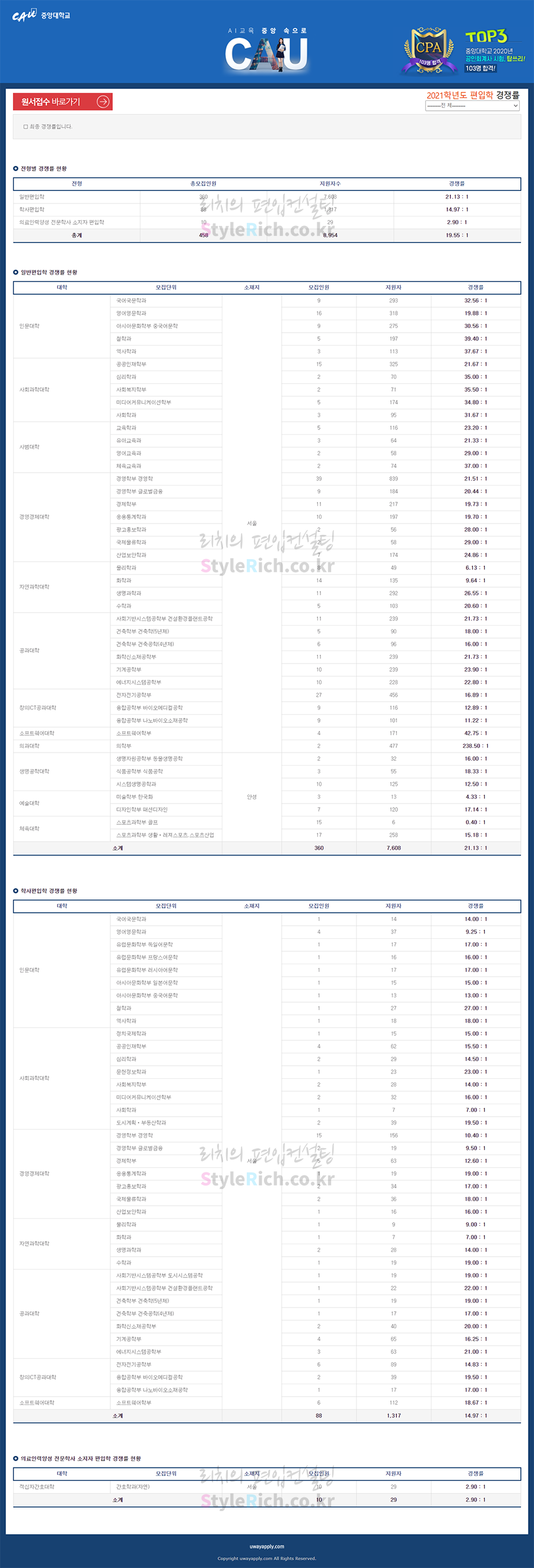 중앙대 편입 2021학년도 경쟁률을 간편하게 보자! 2021.04.14 23:23 편입 경쟁률/2021학년도 경쟁률 2021학년도 중앙대 편입 경쟁률을 살펴보겠습니다. 2021학년도 중앙대 편입 전형별 경쟁률 현황을 보면 일반편입, 학사편입, 의료인력양성 전문학사 소지자편입 순으로 경쟁률이 높습니다. 2021학년도 중앙대 편입 경쟁률 <출처: 유웨이 어플라이> CAU e-Advisor 홍보영상 공유하기 게시글 관리 리치의 편입컨설팅 저작자표시 비영리 변경금지 (새창열림) '편입 경쟁률 > 2021학년도 경쟁률' 카테고리의 다른 글 한국외대 편입 2021학년도 경쟁률을 간편하게 보자! (0) 2021.04.17 한국산업기술대 편입 2021학년도 경쟁률을 간편하게 보자! (0) 2021.04.15 인하대 편입 2021학년도 경쟁률을 간편하게 보자! (0) 2021.04.13 인천대 편입 2021학년도 경쟁률을 간편하게 보자! (0) 2021.04.12 이화여대 편입 2021학년도 경쟁률을 간편하게 보자! (0) 2021.04.11 댓글 공유하기 다른 글 댓글 이 글 공유하기 구독하기 구독하기 카카오톡 카카오톡 라인 라인 트위터 트위터 Facebook Facebook 카카오스토리 카카오스토리 밴드 밴드 네이버 블로그 네이버 블로그 Pocket Pocket Evernote Evernote 다른 글 한국외대 편입 2021학년도 경쟁률을 간편하게 보자! 한국외대 편입 2021학년도 경쟁률을 간편하게 보자! 2021.04.17 한국산업기술대 편입 2021학년도 경쟁률을 간편하게 보자! 한국산업기술대 편입 2021학년도 경쟁률을 간편하게 보자! 2021.04.15 인하대 편입 2021학년도 경쟁률을 간편하게 보자! 인하대 편입 2021학년도 경쟁률을 간편하게 보자! 2021.04.13 인천대 편입 2021학년도 경쟁률을 간편하게 보자! 인천대 편입 2021학년도 경쟁률을 간편하게 보자! 2021.04.12 다른 글 더 둘러보기
