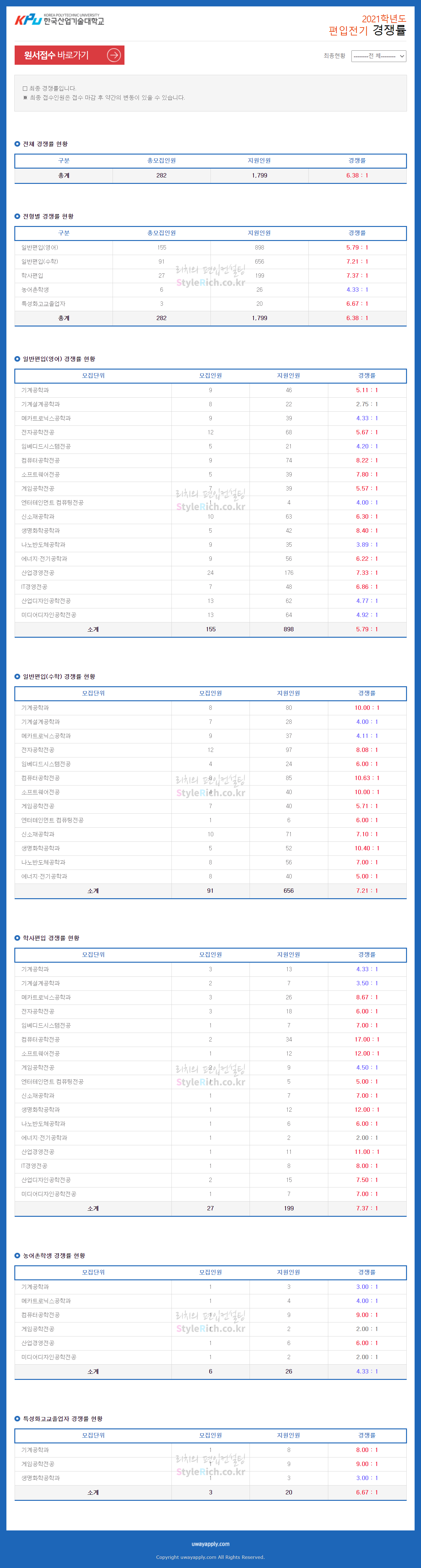 한국산업기술대 편입 2021학년도 경쟁률을 간편하게 보자! 2021.04.15 21:45 편입 경쟁률/2021학년도 경쟁률 2021학년도 한국산업기술대 편입 경쟁률을 살펴보겠습니다. 2021학년도 한국산업기술대 편입 전형별 경쟁률 현황을 보면 학사편입, 일반편입(수학), 특성화고교졸업자편입, 일반편입(영어), 농어촌학생편입 순으로 경쟁률이 높습니다. 2021학년도 한국산업기술대 편입 경쟁률 <출처: 유웨이 어플라이> 😆우진&도현과 캠퍼스 나들이 함께해요! 🏃♂️한국산업기술대 캠퍼스투어! 공유하기 게시글 관리 리치의 편입컨설팅 저작자표시 비영리 변경금지 (새창열림) '편입 경쟁률 > 2021학년도 경쟁률' 카테고리의 다른 글 한국항공대 편입 2021학년도 경쟁률을 간편하게 보자! (0) 2021.04.17 한국외대 편입 2021학년도 경쟁률을 간편하게 보자! (0) 2021.04.17 중앙대 편입 2021학년도 경쟁률을 간편하게 보자! (0) 2021.04.14 인하대 편입 2021학년도 경쟁률을 간편하게 보자! (0) 2021.04.13 인천대 편입 2021학년도 경쟁률을 간편하게 보자! (0) 2021.04.12 댓글 공유하기 다른 글 댓글 이 글 공유하기 구독하기 구독하기 카카오톡 카카오톡 라인 라인 트위터 트위터 Facebook Facebook 카카오스토리 카카오스토리 밴드 밴드 네이버 블로그 네이버 블로그 Pocket Pocket Evernote Evernote 다른 글 한국항공대 편입 2021학년도 경쟁률을 간편하게 보자! 한국항공대 편입 2021학년도 경쟁률을 간편하게 보자! 2021.04.17 한국외대 편입 2021학년도 경쟁률을 간편하게 보자! 한국외대 편입 2021학년도 경쟁률을 간편하게 보자! 2021.04.17 중앙대 편입 2021학년도 경쟁률을 간편하게 보자! 중앙대 편입 2021학년도 경쟁률을 간편하게 보자! 2021.04.14 인하대 편입 2021학년도 경쟁률을 간편하게 보자! 인하대 편입 2021학년도 경쟁률을 간편하게 보자! 2021.04.13 다른 글 더 둘러보기