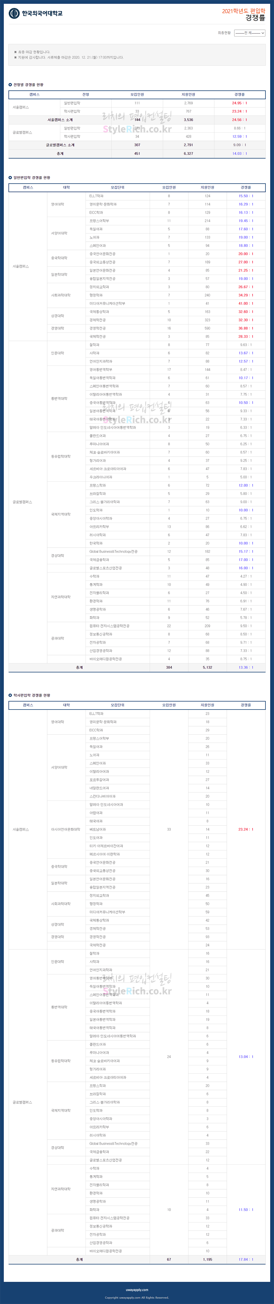 한국외대 편입 2021학년도 경쟁률을 간편하게 보자! 2021.04.17 00:23 편입 경쟁률/2021학년도 경쟁률 2021학년도 한국외대 편입 경쟁률을 살펴보겠습니다. 2021학년도 한국외대 편입 전형별 경쟁률 현황을 보면 서울캠퍼스에서 일반편입, 학사편입, 글로벌캠퍼스에서 학사편입, 일반편입 순으로 경쟁률이 높습니다. 2021학년도 한국외대 편입 경쟁률 <출처: 유웨이 어플라이> [B대면 선배] #1. 첫번째 랜선 선배/수니 선배/척척학사ㅣ📹HUFSon 공유하기 게시글 관리 리치의 편입컨설팅 저작자표시 비영리 변경금지 (새창열림) '편입 경쟁률 > 2021학년도 경쟁률' 카테고리의 다른 글 한성대 편입 2021학년도 경쟁률을 간편하게 보자! (0) 2021.04.18 한국항공대 편입 2021학년도 경쟁률을 간편하게 보자! (0) 2021.04.17 한국산업기술대 편입 2021학년도 경쟁률을 간편하게 보자! (0) 2021.04.15 중앙대 편입 2021학년도 경쟁률을 간편하게 보자! (0) 2021.04.14 인하대 편입 2021학년도 경쟁률을 간편하게 보자! (0) 2021.04.13 댓글 공유하기 다른 글 댓글 이 글 공유하기 구독하기 구독하기 카카오톡 카카오톡 라인 라인 트위터 트위터 Facebook Facebook 카카오스토리 카카오스토리 밴드 밴드 네이버 블로그 네이버 블로그 Pocket Pocket Evernote Evernote 다른 글 한성대 편입 2021학년도 경쟁률을 간편하게 보자! 한성대 편입 2021학년도 경쟁률을 간편하게 보자! 2021.04.18 한국항공대 편입 2021학년도 경쟁률을 간편하게 보자! 한국항공대 편입 2021학년도 경쟁률을 간편하게 보자! 2021.04.17 한국산업기술대 편입 2021학년도 경쟁률을 간편하게 보자! 한국산업기술대 편입 2021학년도 경쟁률을 간편하게 보자! 2021.04.15 중앙대 편입 2021학년도 경쟁률을 간편하게 보자! 중앙대 편입 2021학년도 경쟁률을 간편하게 보자! 2021.04.14 다른 글 더 둘러보기