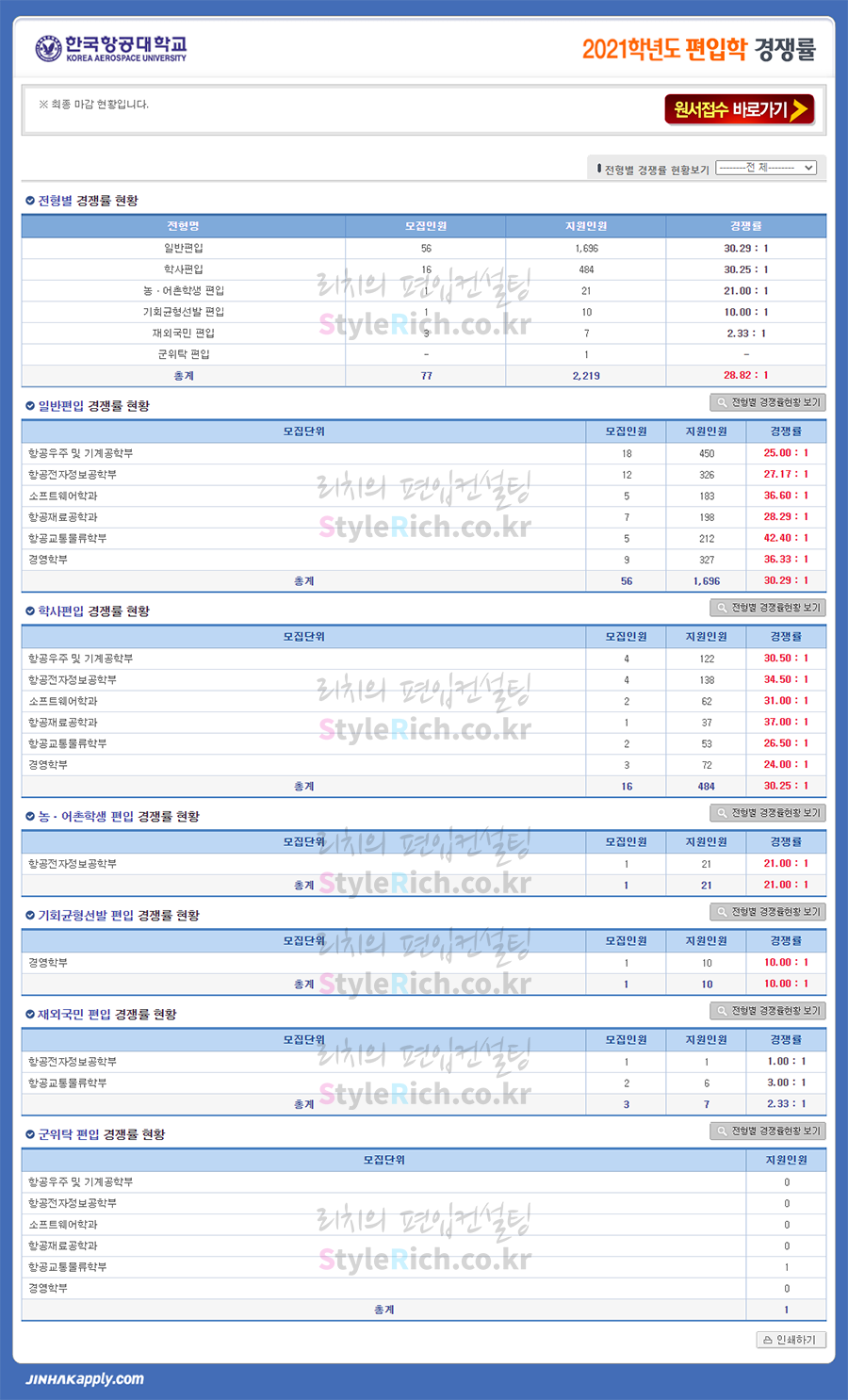 한국항공대 편입 2021학년도 경쟁률을 간편하게 보자! 2021.04.17 18:56 편입 경쟁률/2021학년도 경쟁률 2021학년도 한국항공대 편입 경쟁률을 살펴보겠습니다. 2021학년도 한국항공대 편입 전형별 경쟁률 현황을 보면 일반편입, 학사편입, 농어촌학생편입, 기회균형선발편입, 재외국민편입 순으로 경쟁률이 높습니다. 2021학년도 한국항공대 편입 경쟁률 <출처: 진학사 원서접수> ㅋㄹㄴ때문에 도서관 못 가봤지? 입벌려 일 인칭 탐방 들어간다! (Feat. 새로운 대출 시스템) | 한국항공대 중앙도서관 탐방📔 공유하기 게시글 관리 리치의 편입컨설팅 저작자표시 비영리 변경금지 (새창열림) '편입 경쟁률 > 2021학년도 경쟁률' 카테고리의 다른 글 한양대(에리카) 편입 2021학년도 경쟁률을 간편하게 보자! (0) 2021.04.19 한성대 편입 2021학년도 경쟁률을 간편하게 보자! (0) 2021.04.18 한국외대 편입 2021학년도 경쟁률을 간편하게 보자! (0) 2021.04.17 한국산업기술대 편입 2021학년도 경쟁률을 간편하게 보자! (0) 2021.04.15 중앙대 편입 2021학년도 경쟁률을 간편하게 보자! (0) 2021.04.14 댓글 공유하기 다른 글 댓글 이 글 공유하기 구독하기 구독하기 카카오톡 카카오톡 라인 라인 트위터 트위터 Facebook Facebook 카카오스토리 카카오스토리 밴드 밴드 네이버 블로그 네이버 블로그 Pocket Pocket Evernote Evernote 다른 글 한양대(에리카) 편입 2021학년도 경쟁률을 간편하게 보자! 한양대(에리카) 편입 2021학년도 경쟁률을 간편하게 보자! 2021.04.19 한성대 편입 2021학년도 경쟁률을 간편하게 보자! 한성대 편입 2021학년도 경쟁률을 간편하게 보자! 2021.04.18 한국외대 편입 2021학년도 경쟁률을 간편하게 보자! 한국외대 편입 2021학년도 경쟁률을 간편하게 보자! 2021.04.17 한국산업기술대 편입 2021학년도 경쟁률을 간편하게 보자! 한국산업기술대 편입 2021학년도 경쟁률을 간편하게 보자! 2021.04.15 다른 글 더 둘러보기