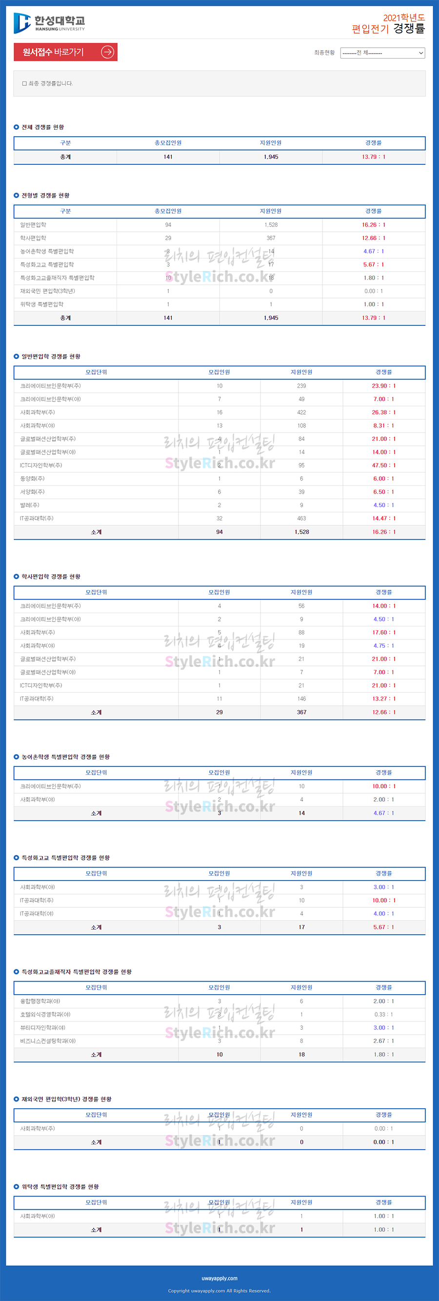 한성대 편입 2021학년도 경쟁률을 간편하게 보자! 2021.04.18 10:30 편입 경쟁률/2021학년도 경쟁률 2021학년도 한성대 편입 경쟁률을 살펴보겠습니다. 2021학년도 한성대 편입 전형별 경쟁률 현황을 보면 일반편입, 학사편입, 특성화고교 특별편입, 농어촌학생 특별편입, 특성화고교졸재직자 특별편입, 위탁생 특별편입 순으로 경쟁률이 높습니다. 2021학년도 한성대 편입 경쟁률 <출처: 유웨이 어플라이> [퀴즈] 인싸 한성인😎이라면 당연히 💯점 이겠죠? 공유하기 게시글 관리 리치의 편입컨설팅 저작자표시 비영리 변경금지 (새창열림) '편입 경쟁률 > 2021학년도 경쟁률' 카테고리의 다른 글 한양대 편입 2021학년도 경쟁률을 간편하게 보자! (0) 2021.04.19 한양대(에리카) 편입 2021학년도 경쟁률을 간편하게 보자! (0) 2021.04.19 한국항공대 편입 2021학년도 경쟁률을 간편하게 보자! (0) 2021.04.17 한국외대 편입 2021학년도 경쟁률을 간편하게 보자! (0) 2021.04.17 한국산업기술대 편입 2021학년도 경쟁률을 간편하게 보자! (0) 2021.04.15 댓글 공유하기 다른 글 댓글 이 글 공유하기 구독하기 구독하기 카카오톡 카카오톡 라인 라인 트위터 트위터 Facebook Facebook 카카오스토리 카카오스토리 밴드 밴드 네이버 블로그 네이버 블로그 Pocket Pocket Evernote Evernote 다른 글 한양대 편입 2021학년도 경쟁률을 간편하게 보자! 한양대 편입 2021학년도 경쟁률을 간편하게 보자! 2021.04.19 한양대(에리카) 편입 2021학년도 경쟁률을 간편하게 보자! 한양대(에리카) 편입 2021학년도 경쟁률을 간편하게 보자! 2021.04.19 한국항공대 편입 2021학년도 경쟁률을 간편하게 보자! 한국항공대 편입 2021학년도 경쟁률을 간편하게 보자! 2021.04.17 한국외대 편입 2021학년도 경쟁률을 간편하게 보자! 한국외대 편입 2021학년도 경쟁률을 간편하게 보자! 2021.04.17 다른 글 더 둘러보기