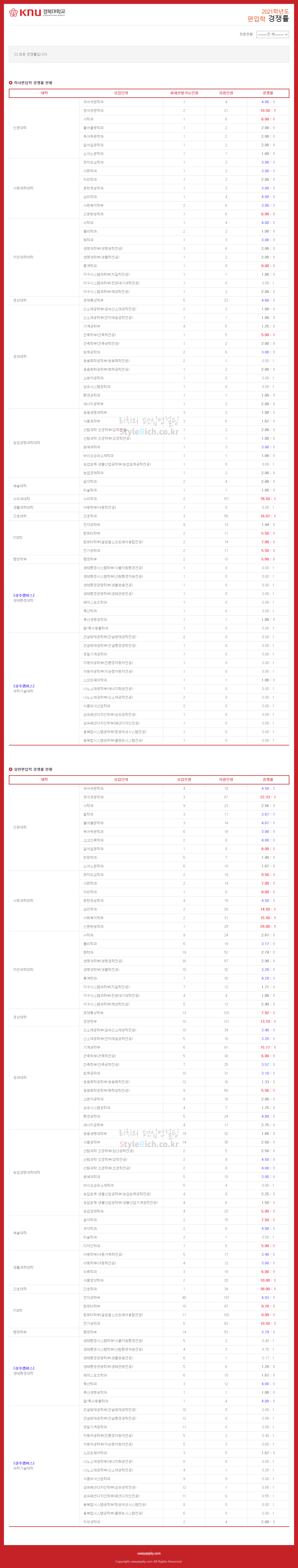 경북대 편입 2021학년도 경쟁률을 간편하게 보자! 2021.04.25 13:35 편입 경쟁률/2021학년도 경쟁률 2021학년도 경북대 편입 경쟁률을 살펴보겠습니다. 2021학년도 경북대 편입 전형별 경쟁률 현황을 보면 학사편입, 일반편입 순으로 경쟁률이 높고, 상주캠퍼스는 일반편입, 학사편입 순으로 경쟁률이 높습니다. 2021학년도 경북대 편입 경쟁률 <출처: 유웨이 어플라이> 경북대학교 중앙도서관 홍보 영상 공유하기 게시글 관리 리치의 편입컨설팅 저작자표시 비영리 변경금지 (새창열림) '편입 경쟁률 > 2021학년도 경쟁률' 카테고리의 다른 글 부산대 편입 2021학년도 경쟁률을 간편하게 보자! (0) 2021.04.27 경상대 편입 2021학년도 경쟁률을 간편하게 보자! (0) 2021.04.26 강원대 편입 2021학년도 경쟁률을 간편하게 보자! (0) 2021.04.23 홍익대 편입 2021학년도 경쟁률을 간편하게 보자! (0) 2021.04.21 한양대 편입 2021학년도 경쟁률을 간편하게 보자! (0) 2021.04.19 댓글 공유하기 다른 글 댓글 이 글 공유하기 구독하기 구독하기 카카오톡 카카오톡 라인 라인 트위터 트위터 Facebook Facebook 카카오스토리 카카오스토리 밴드 밴드 네이버 블로그 네이버 블로그 Pocket Pocket Evernote Evernote 다른 글 부산대 편입 2021학년도 경쟁률을 간편하게 보자! 부산대 편입 2021학년도 경쟁률을 간편하게 보자! 2021.04.27 경상대 편입 2021학년도 경쟁률을 간편하게 보자! 경상대 편입 2021학년도 경쟁률을 간편하게 보자! 2021.04.26 강원대 편입 2021학년도 경쟁률을 간편하게 보자! 강원대 편입 2021학년도 경쟁률을 간편하게 보자! 2021.04.23 홍익대 편입 2021학년도 경쟁률을 간편하게 보자! 홍익대 편입 2021학년도 경쟁률을 간편하게 보자! 2021.04.21 다른 글 더 둘러보기