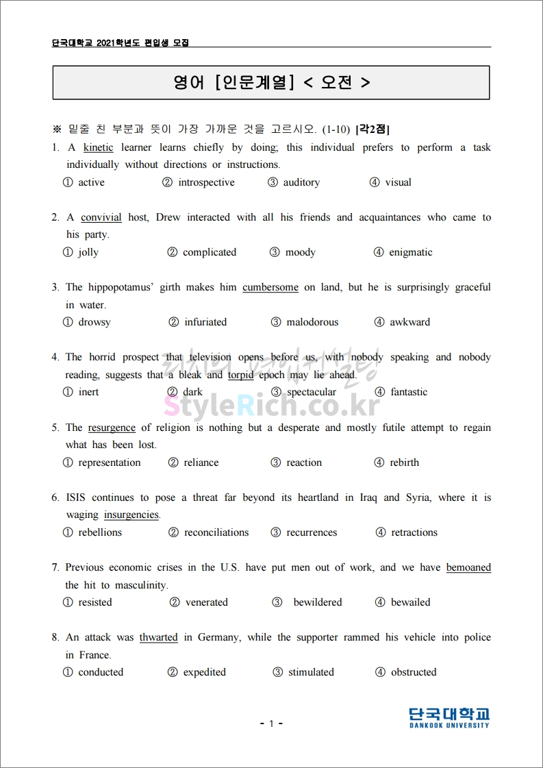 2021학년도 단국대(천안) 편입 기출문제가 궁금하다면?