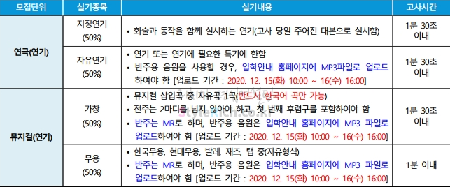 2021학년도 단국대(죽전) 편입 공연영화학부 실기고사는 연극(연기), 뮤지컬(연기)에 따라 실기종목이 다릅니다.