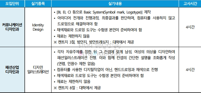 2021학년도 단국대(죽전) 편입 미술계열 실기고사의 모집단위별 실기종목입니다.