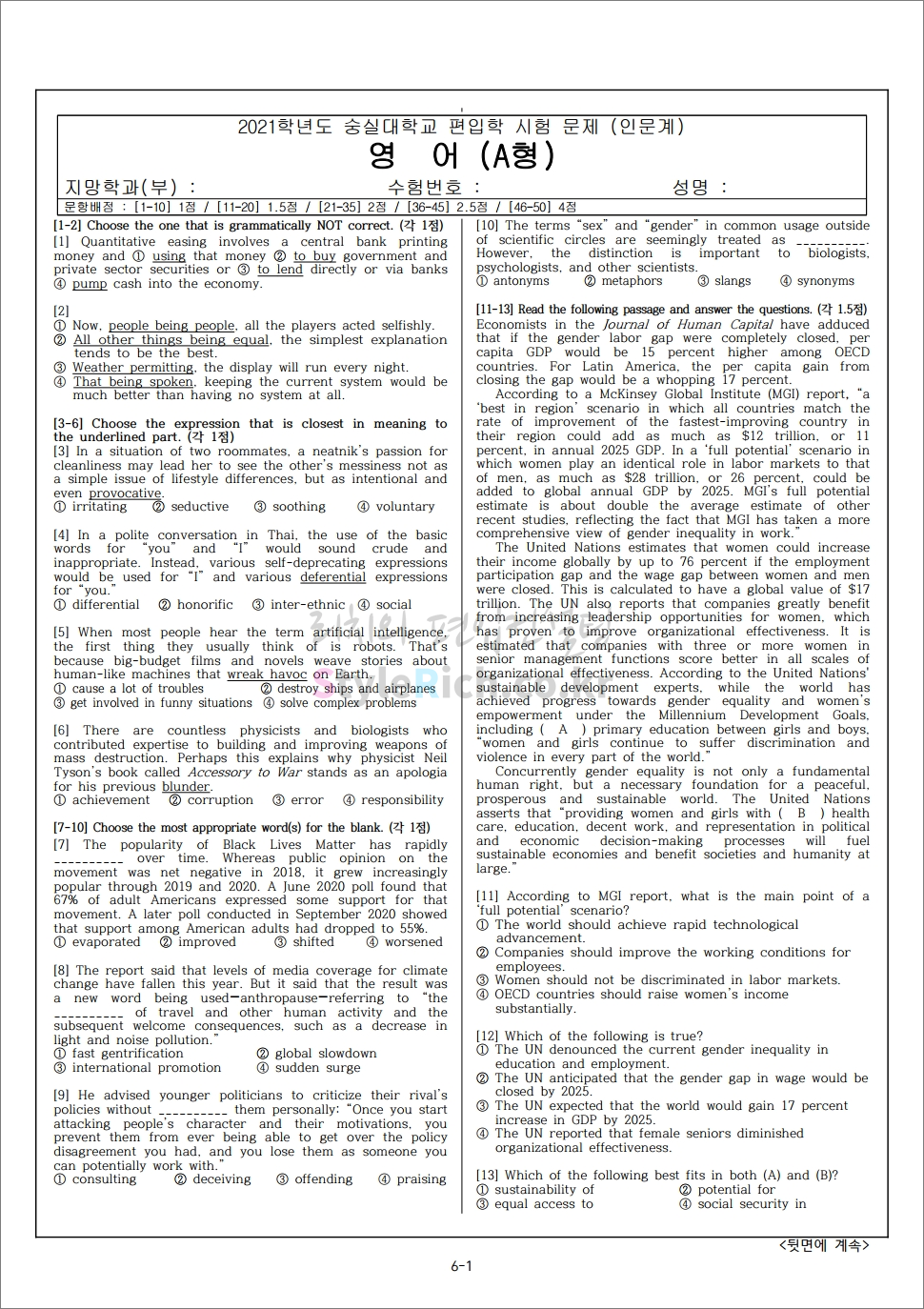 2021학년도 숭실대 편입 기출문제가 궁금하다면?