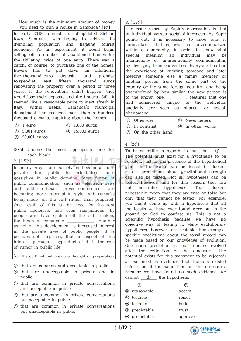 2021학년도 인하대 편입 기출문제가 궁금하다면?