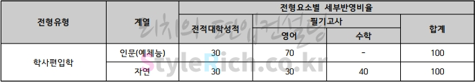 2021학년도 인하대 학사편입에서 인문(예체능)은 영어 70, 전적대 성적 30이고, 자연은 영어 30, 수학 40, 전적대 성적 30입니다.
