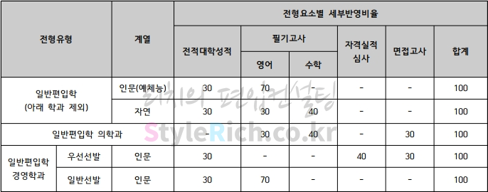 2021학년도 인하대 학사편입에서 인문(예체능)은 영어 70, 전적대 성적 30이고, 자연은 영어 30, 수학 40, 전적대 성적 30입니다.