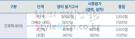 2021학년도 한양대 간호학과(야) 편입은 1단계 영어 100%, 2단계 영어 40%, 서류 60%입니다.