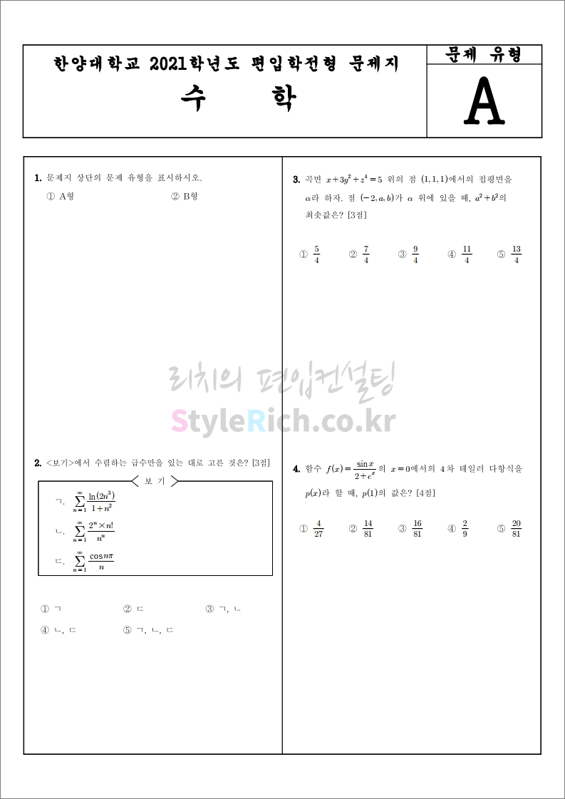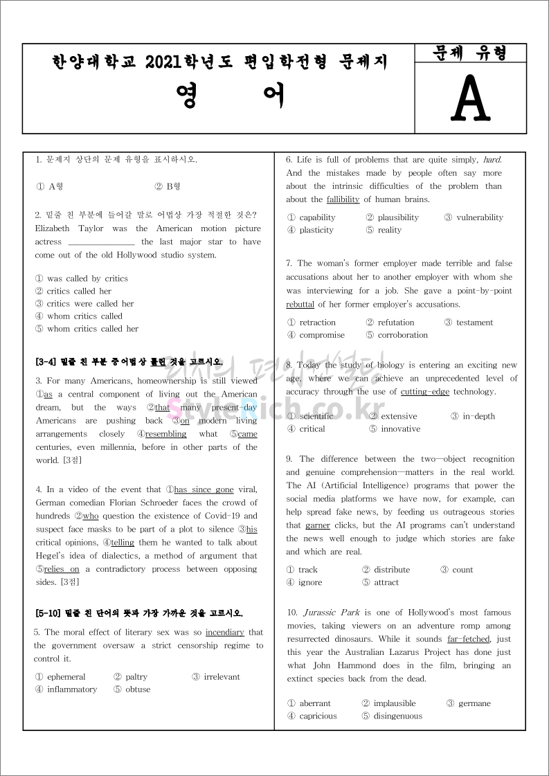 2021학년도 한양대 영어 필기고사는 40문항/70분, 객관식 5지선다형, 총 100점 만점에 20문항 2점, 20문항 3점으로 구성되어 있습니다. 수학고사는 25문항/70분, 20문항 객관식 5지선다형, 5문항 단답형 주관식, 총 100점 만점에 3, 4, 5점으로 문항당 배점이 다릅니다.