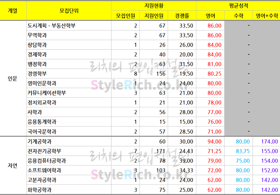 (자연계의 경우 영어+수학 합산 점수 기준으로 정렬)
