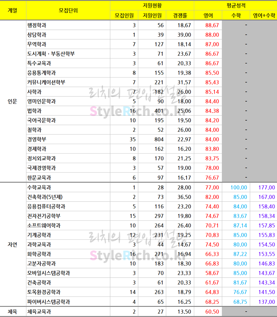 (자연계의 경우 영어+수학 합산 점수 기준으로 정렬)