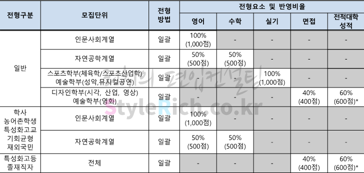 2021학년도 명지대 편입 전형방법에서 인문사회계열은 영어 100%, 자연공학계열은 영어 50%, 수학 50%입니다. 일반편입 스포츠학부(체육학/스포츠산업학)은 실기 100%, 예술학부(성악, 뮤지컬공연)과 특성화고등졸재직자는 면접 40%, 전적대 성적 60%입니다.