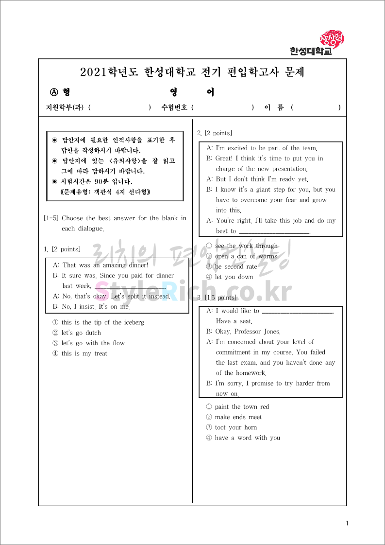 2021학년도 한성대 편입 기출문제가 궁금하다면?