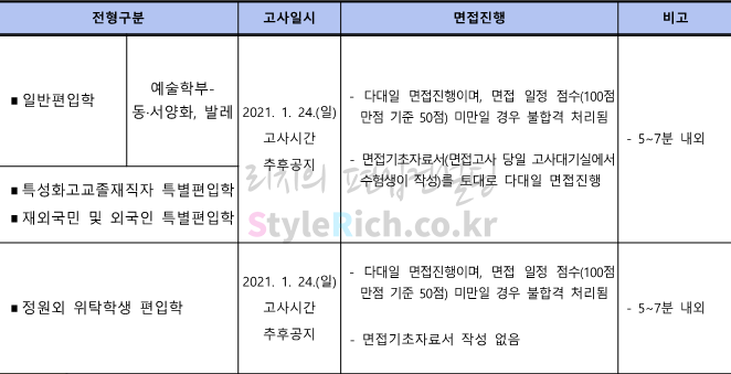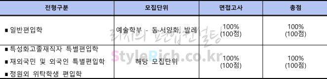 2021학년도 한성대 일반편입 예술학부 동·서양화, 발레, 특성화고졸재직자 특별편입, 재외국민 및 외국인 특별편입, 정원외 위탁학생 편입은 면접고사 100%입니다.