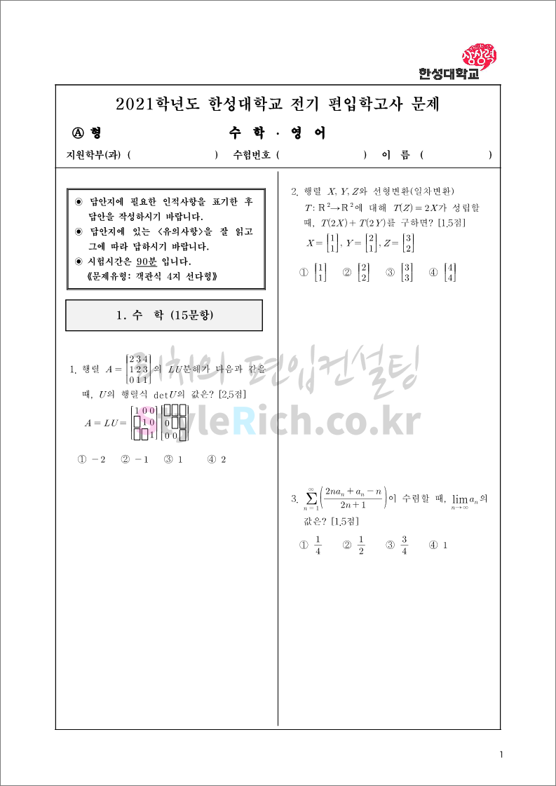 2021학년도 한성대 편입 기출문제를 살펴보겠습니다.