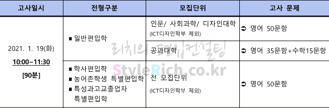 2021학년도 한성대 일반편입 인문, 사회과학, 디자인대학(ICT디자인학부 제외)은 영어, 공과대학은 영어+수학, 학사편입, 농어촌학생 특별편입, 특성과고교졸업자 특별편입 전 모집단위(ICT디자인학부 제외)는 영어 필기고사를 실시합니다. 영어 필기고사는 50문항/90분, 객관식 4지선다형, 100점 만점에 문항당 배점은 1.5, 2, 2.5점입니다.