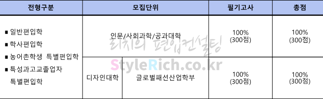 2021학년도 한성대 편입 인문,사회과학,공과대학, 디자인대학 글로벌패션산업학부의 전형방법은 필기고사 100%입니다.