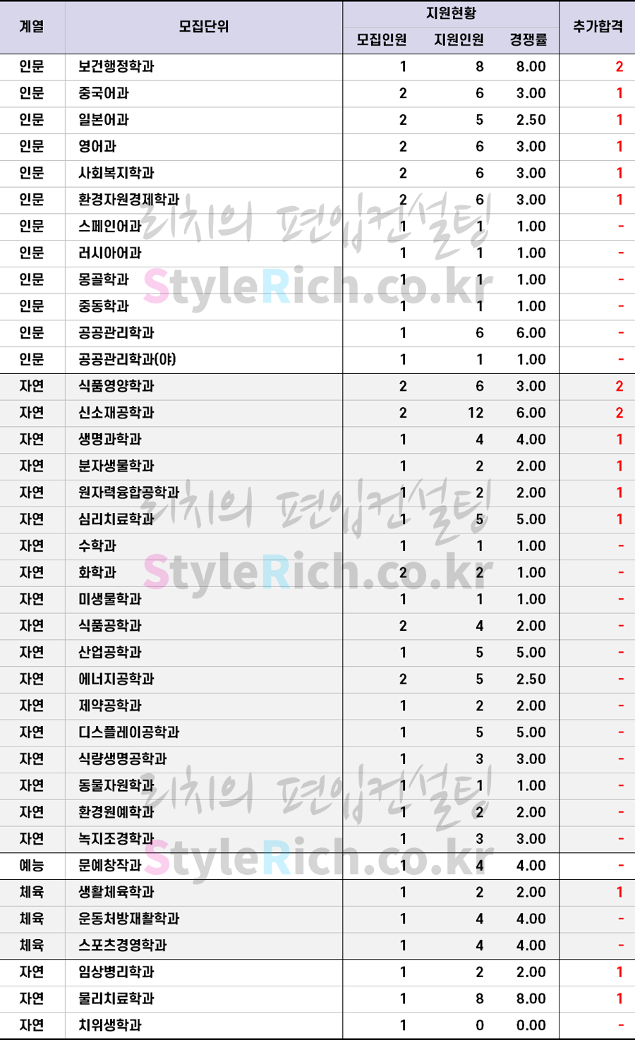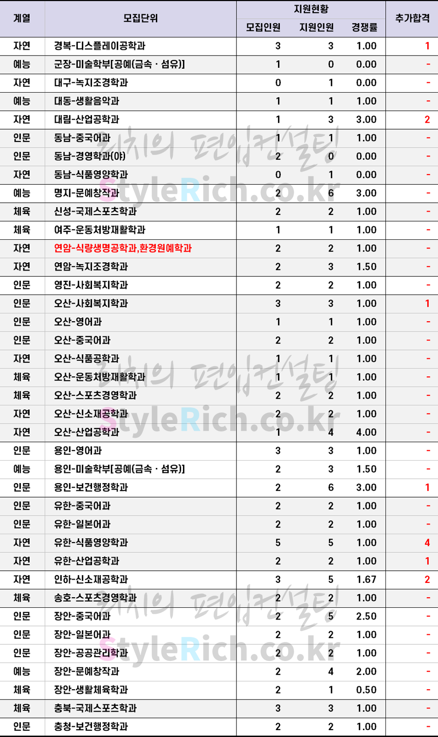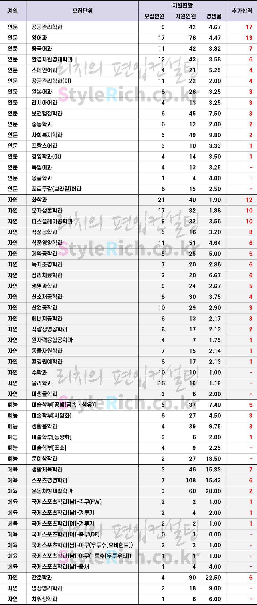 * 일반편입, 학사편입은 인문, 자연, 예능, 체육으로 분류 후 추가합격이 많은 순으로 정렬