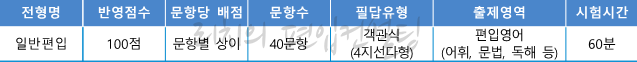 2021학년도 일반편입(영어), 학사편입 영어 필기고사는 40문항/60분, 객관식 4지선다형, 총점 100점 만점에 배점은 2, 2.5, 3점으로 문항마다 다릅니다. 출제영역은 어휘, 문법, 독해 등으로 구성되어 있습니다.
