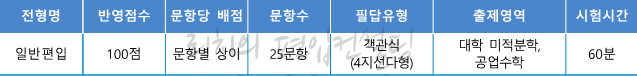2021학년도 일반편입(수학) 수학 필기고사는 25문항/60분, 객관식 4지선다형, 총점 100점 만점에 배점은 3, 4, 5점으로 문항마다 다릅니다. 출제영역은 미적분학, 공업수학입니다.