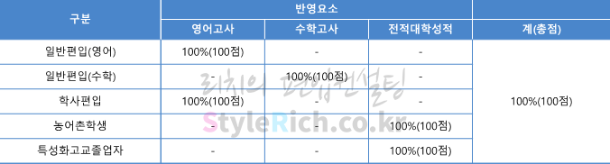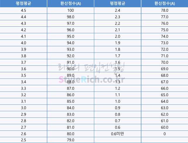 2021학년도 한국산업기술대 농어촌학생편입, 특성화고교졸업자편입의 전적대성적 환산은 평점평균 만점이 4.5기준으로 표시하고 있지만 4.0 또는 4.3일 경우 4.5만점으로 환산합니다.