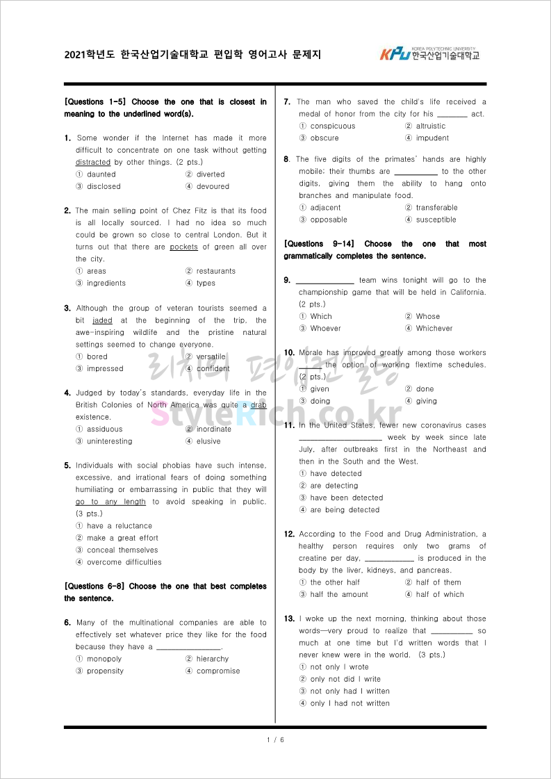 2021학년도 한국산업기술대 편입 기출문제가 궁금하다면?