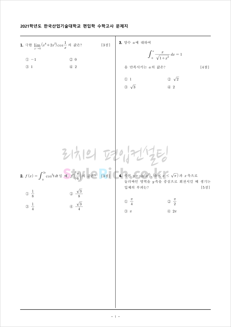 2021학년도 한국산업기술대 편입 기출문제를 살펴보겠습니다.
