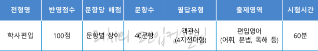 2021학년도 일반편입(영어), 학사편입 영어 필기고사는 40문항/60분, 객관식 4지선다형, 총점 100점 만점에 배점은 2, 2.5, 3점으로 문항마다 다릅니다. 출제영역은 어휘, 문법, 독해 등으로 구성되어 있습니다.