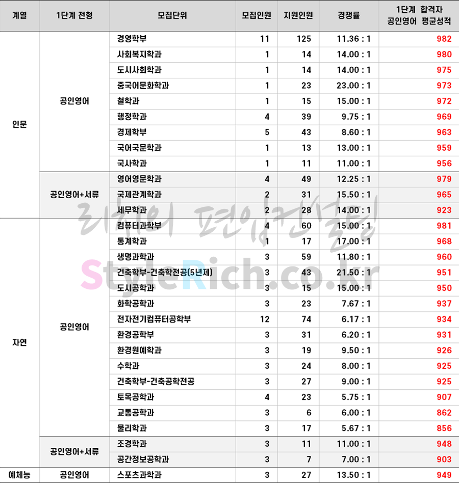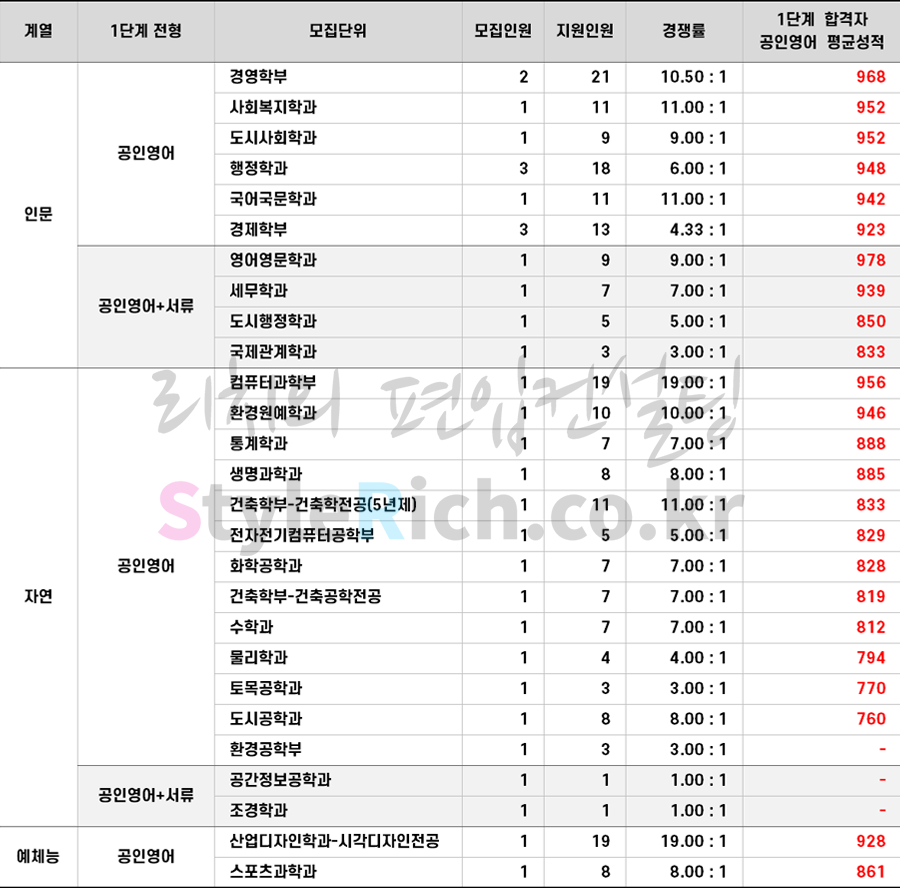 * 모집단위별 1단계 합격자의 공인영어(토익) 평균성적